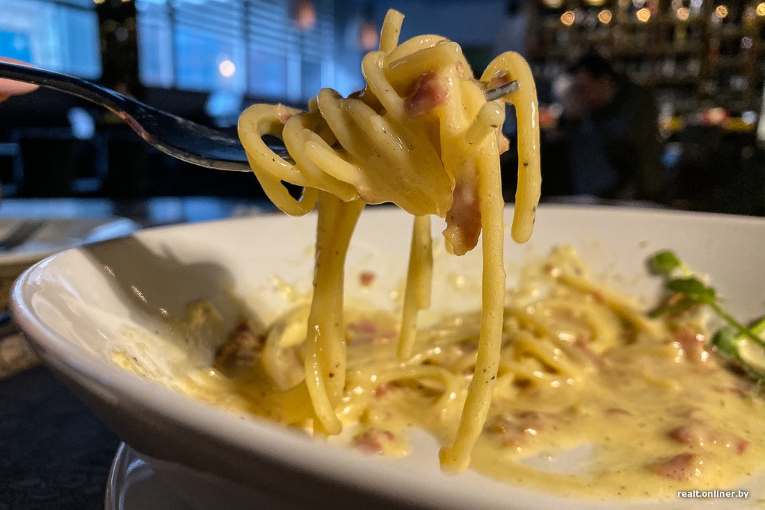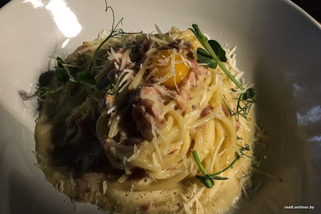 Пасту «Карбонара» готовили долго и почему-то принесли остывшей. Но если абстрагироваться от этого, в ней все вроде было неплохо, кроме не особо приятного вкуса бекона, который навязчиво перебивал остальные. Почему так произошло? Вероятно, причина — в том месте, где этот бекон покупался.