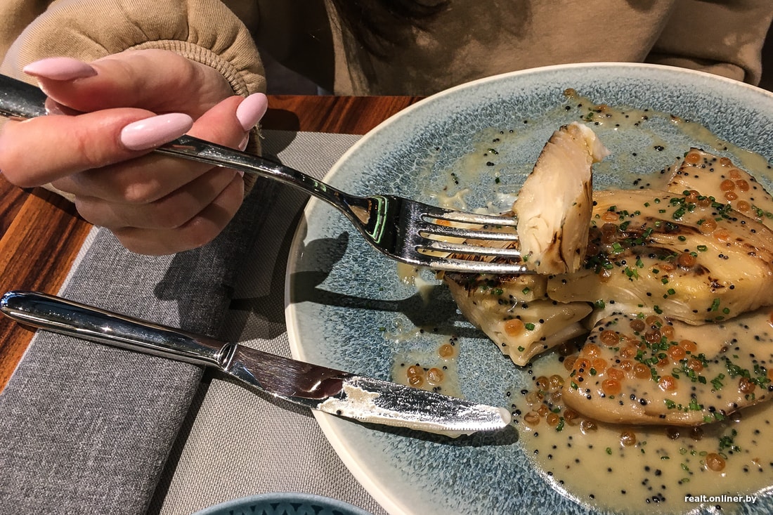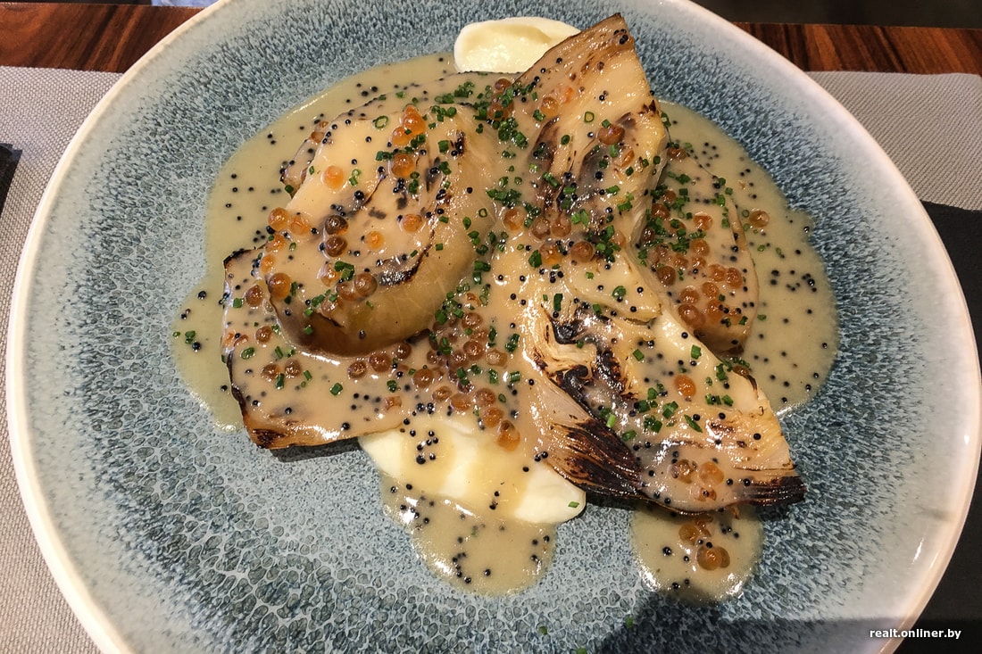 Жженая капуста — странно видеть такое предельно простое блюдо в ресторане. Вероятно, чтобы сделать эту простоту чуть пафоснее, к капусте добавили икру форели и щуки. Чаще можно встретить вариант со жженой цветной капустой, а тут решили поэкспериментировать с кочанной. Незнакомое, но интересное вкусовое сочетание.