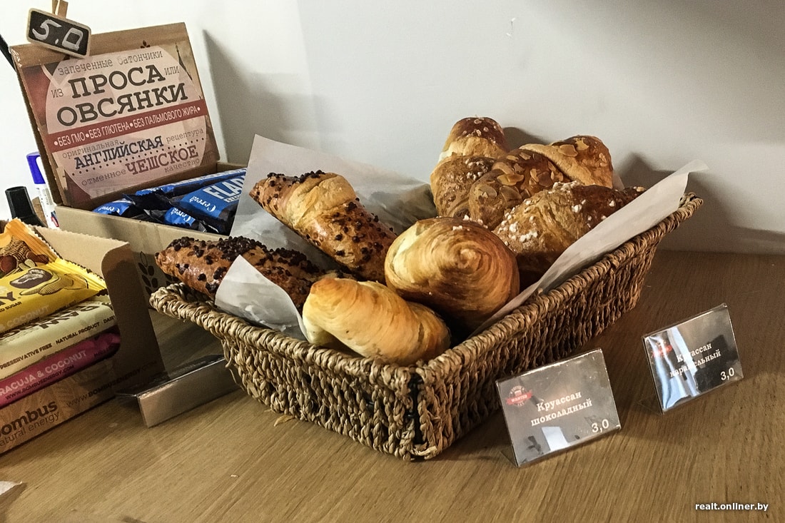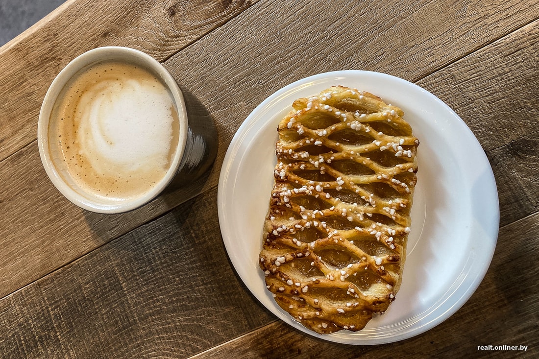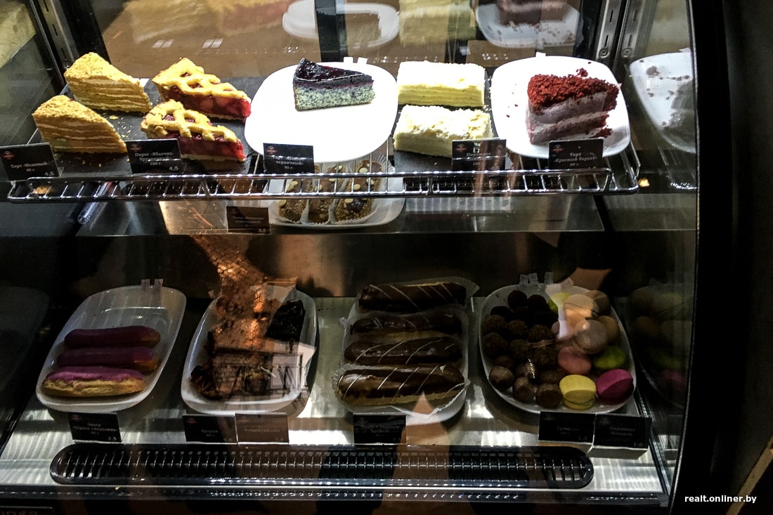 Зайдя сюда, сразу чувствуешь приятный запах запеченных булочек. Так пахнут яблочные слойки, которые делаются прямо здесь. Ассортимент десертов пошире, чем в предыдущей кофейне. Напитков тоже много. На днях здесь начнут печь блины с разными начинками.