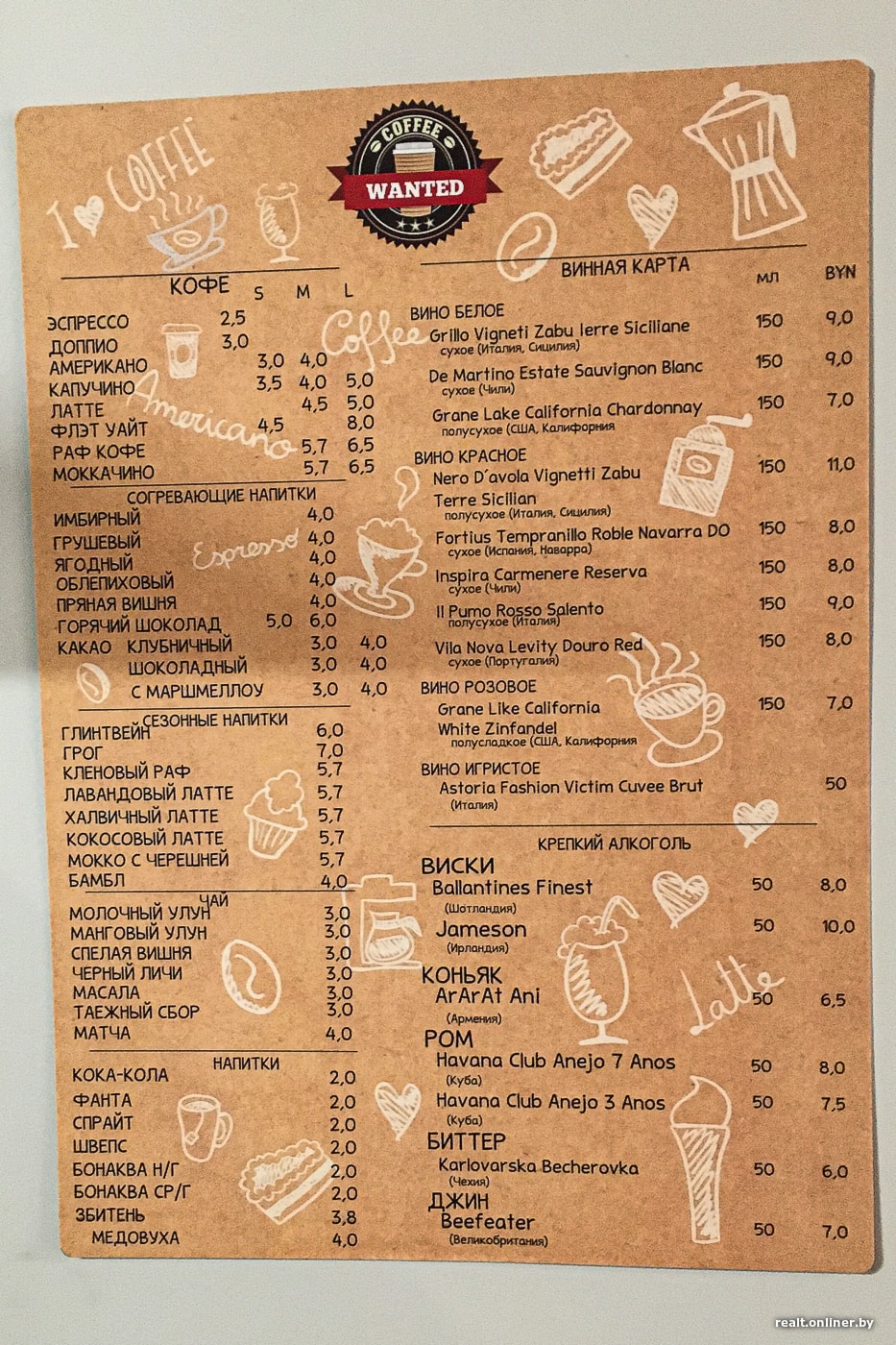 Цены в меню выше средних по Минску. Даже самый обычный капучино стоит 5 рублей. Об остальном судите сами.
