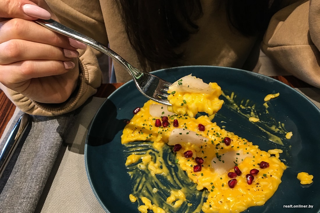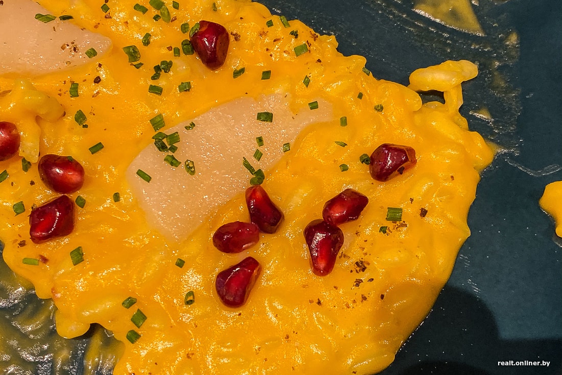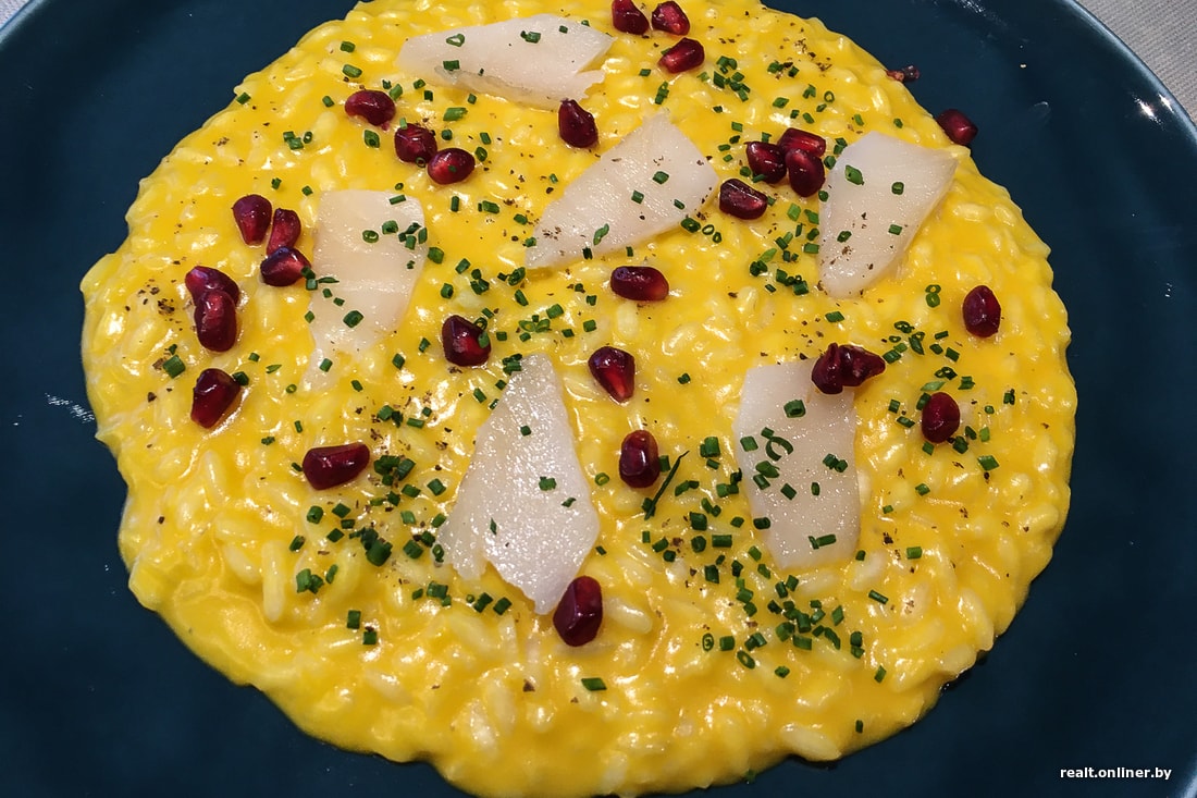 Ризотто выглядит красиво и аппетитно. Выдержаны все вкусовые балансы, кроме одного: дико соленые кусочки рыбы мешают менее яркому вкусу риса.