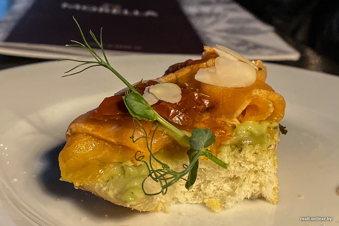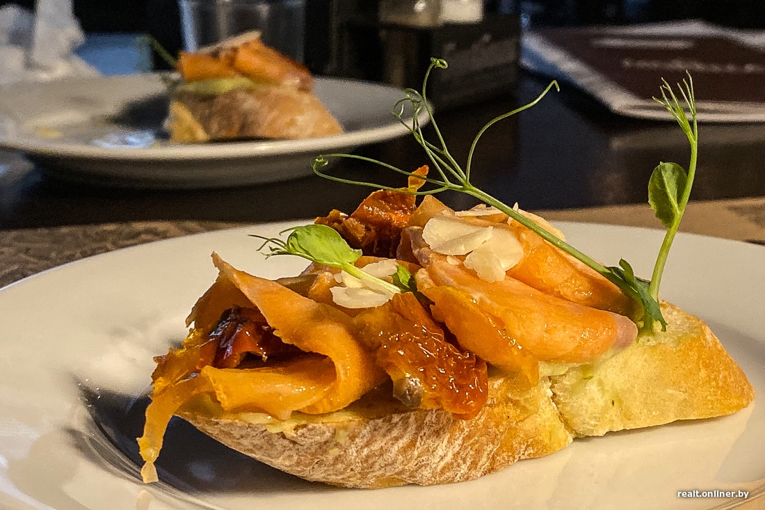 Начинка брускетт неплоха: лосось отлично сочетается с муссом из авокадо и вялеными помидорами. Сами брускетты хотелось бы слегка поджарить и обдать маслом.