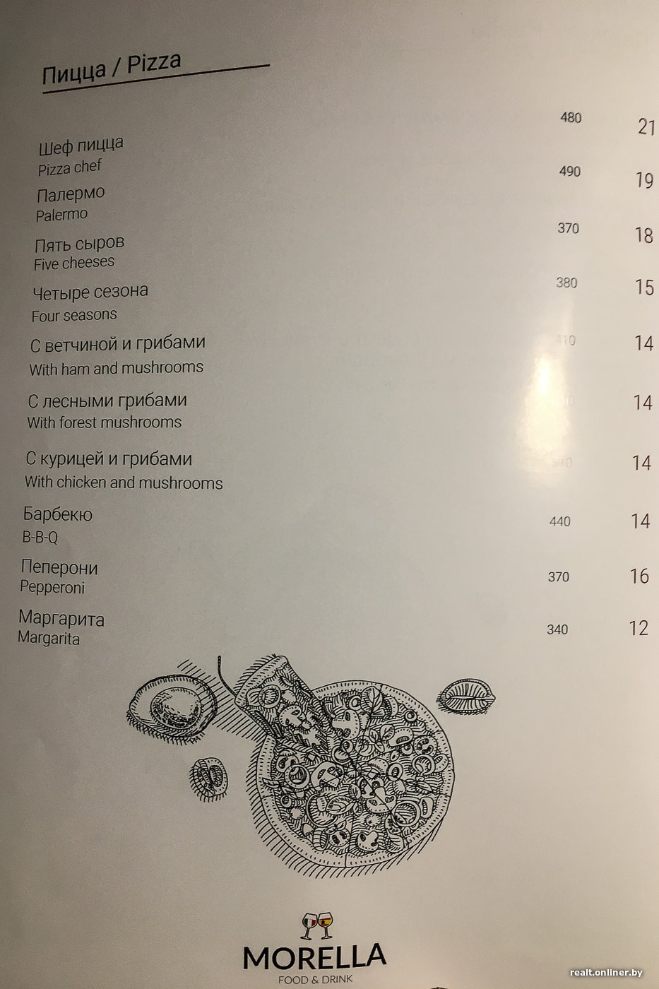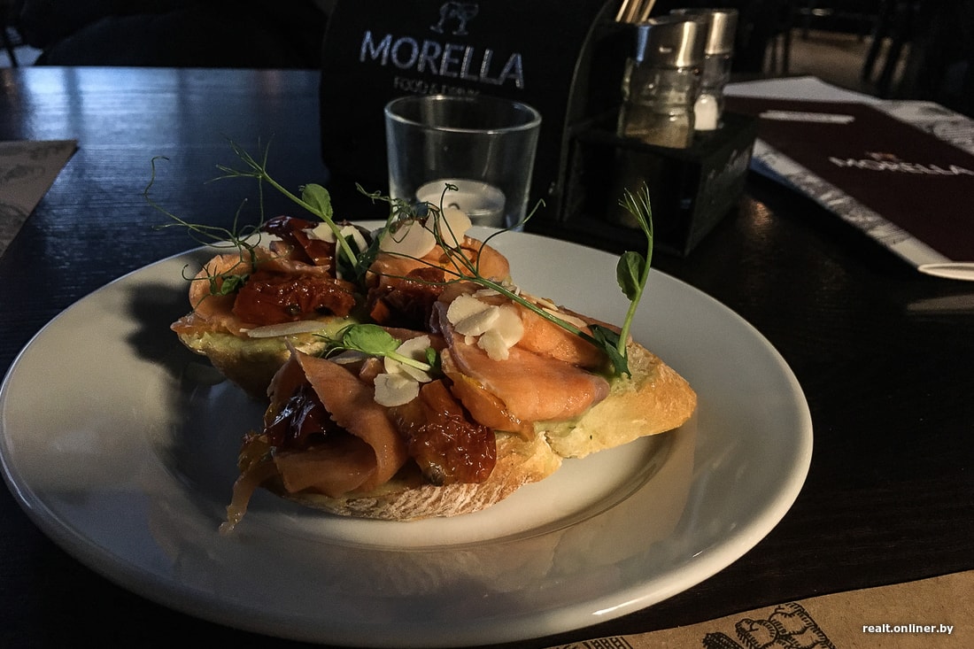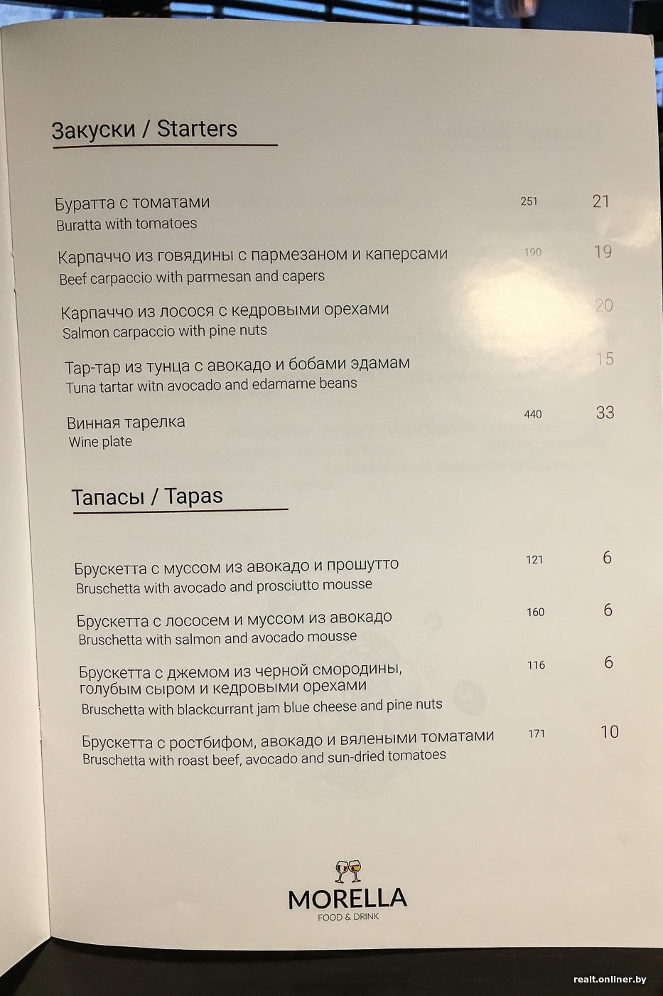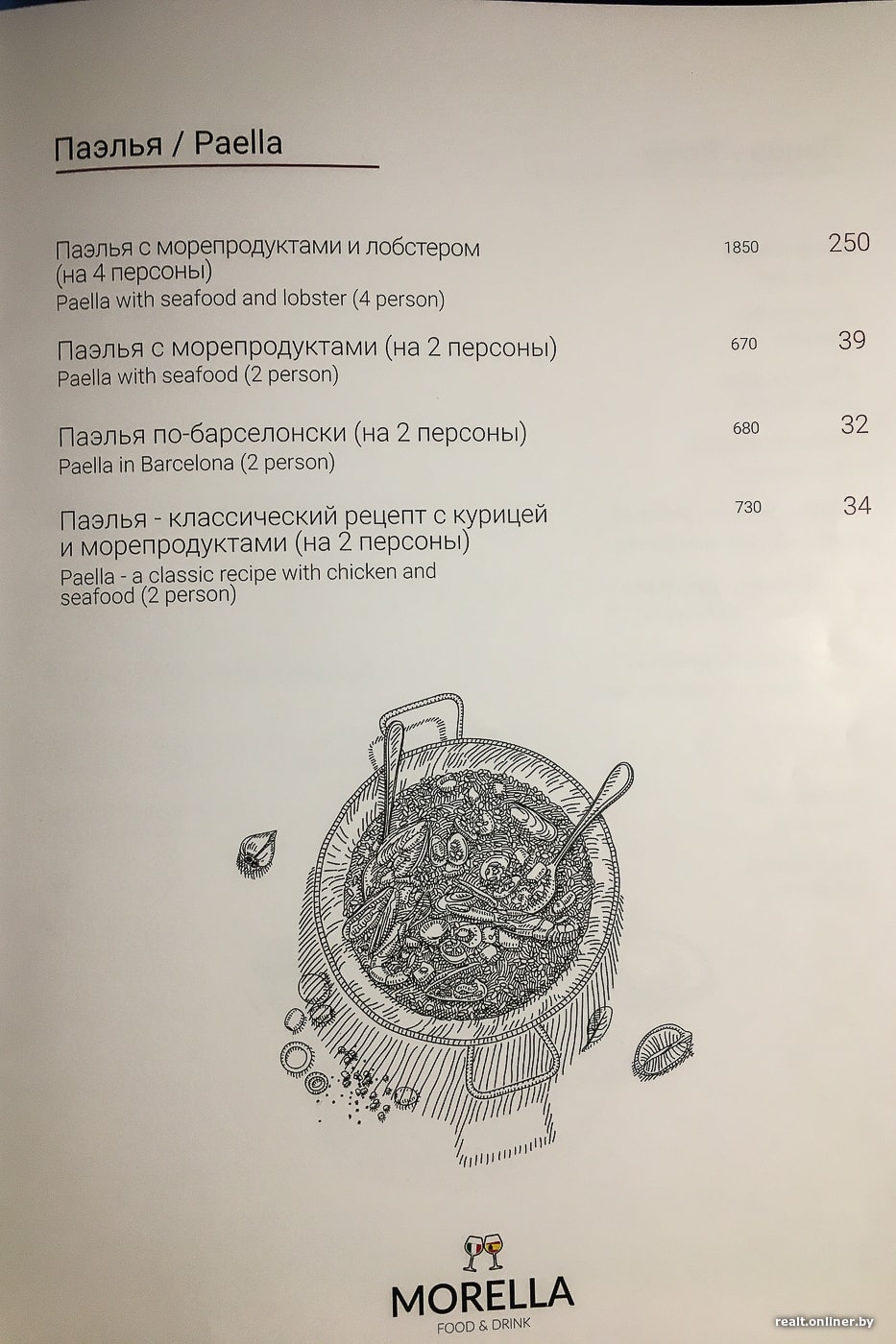 В Morella x Bazis Bar решили сделать акцент на испанской кухне. Сразу на входе стоит печка для пиццы. Фишка меню — большая сковорода паэльи, приготовленной по оригинальному рецепту из города Морелья. Стоимость — 250 рублей. Блюда, судя по всему, рассчитаны на большую компанию. Есть обеденное меню, действующее с 12:00 до 16:00.