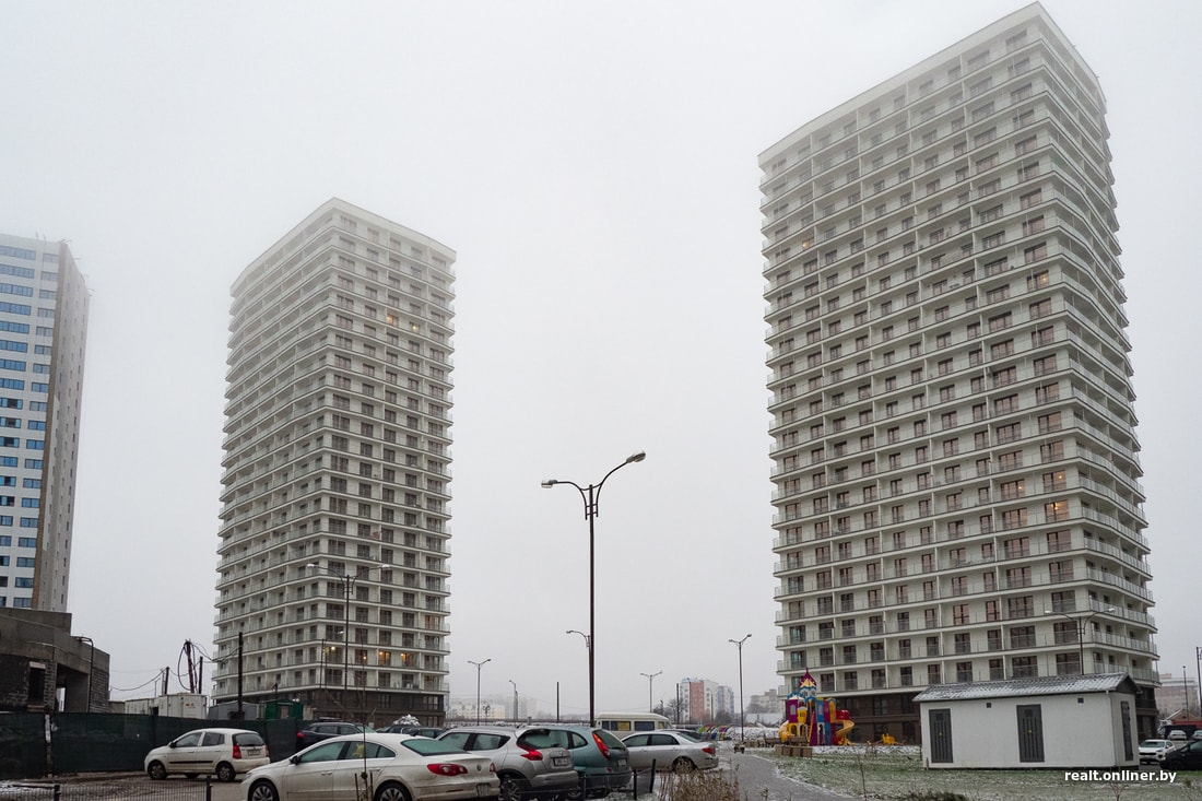 Надо отметить, что над архитектурой этого жилого комплекса поработали (все-таки комфорт-класс). Это уже не просто максимально прагматичные стены, а стены со скандинавскими мотивами: конфигурация окон, «капсульные» балконы, графитовый и белый в оформлении фасада. Впрочем, урбанисты и неравнодушные минчане ожидали от этого ЖК большего, а именно настоящей современной европейской архитектуры, где все машины спрятаны в подземные паркинги, а дома не давят своей высотой. Но опять же, пока мы видим рендеры и «скелеты» будущих домов. Оценить постройки можно будет лишь в следующем году. А то, придерживается застройщик изначальной концепции или меняет проект на ходу, выяснится и того позже.