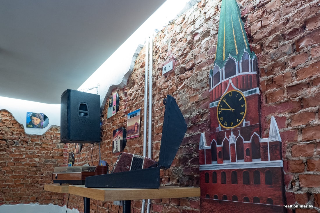 «Здесь у нас главный супергерой того времени», — улыбаются в заведении. Рядом копия работы, характеризующая эпоху: Леонид Брежнев целуется с Эрихом Хонеккером.