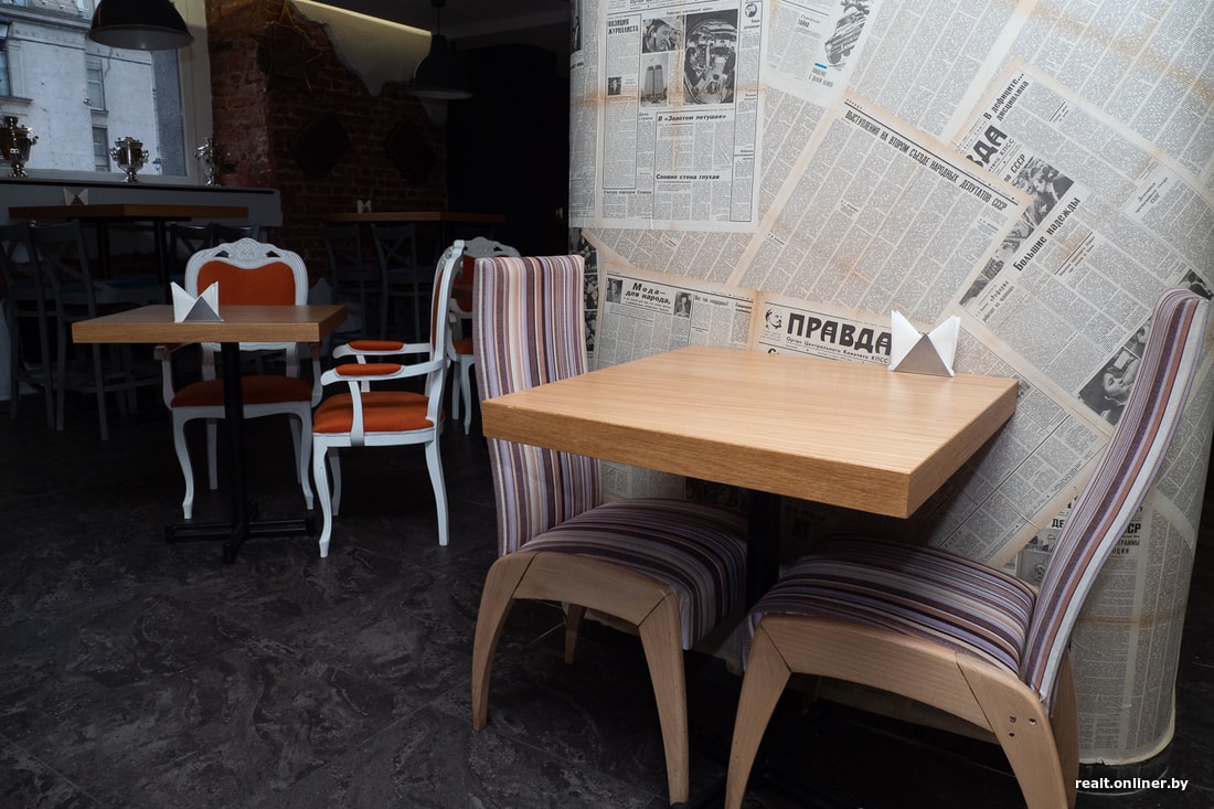 Интерьером «Перестройки» хозяева занимались сами. Основной зал оклеили старыми газетами, на стене второго этажа уложили паркет-елочку, который украсили граффити с культовыми личностями того времени. Портрет Виктора Цоя писал плиточник в свободное от работы время.
