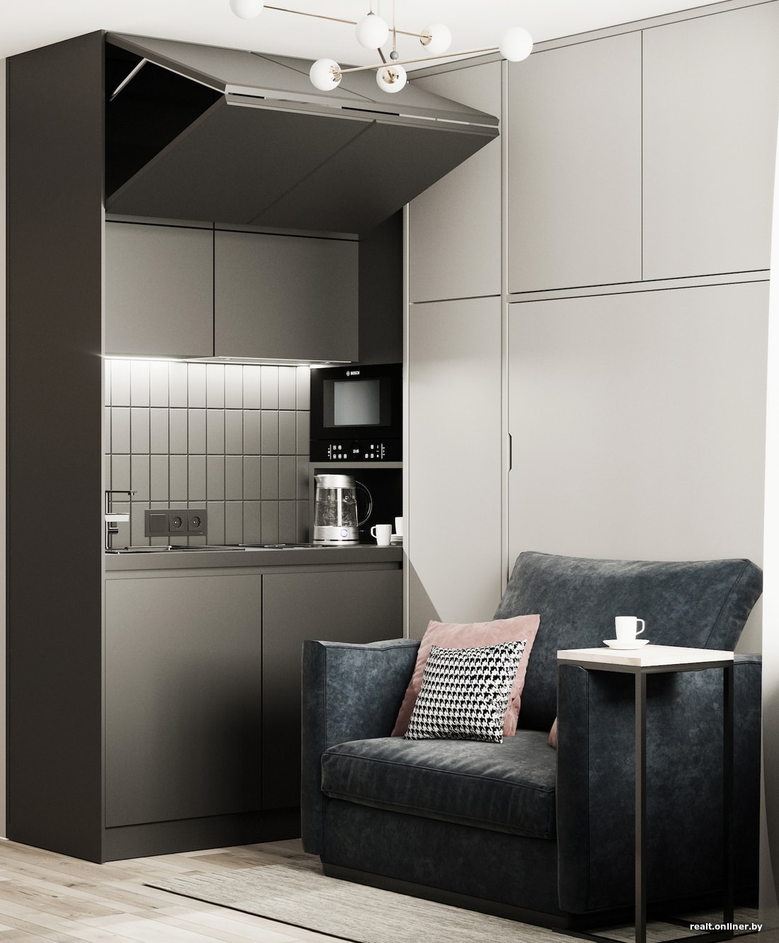 Всю рабочую зону кухни мы будем закрывать за фасадом. Внешне это будет выглядеть как встроенный шкаф. Фасадные панели будут по необходимости подниматься вверх и открывать рабочую поверхность кухни.