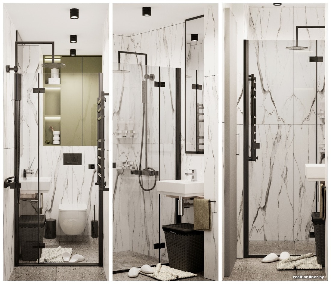 — Поскольку речь идет о квартире, которая находится в обычном жилом доме, а не в комплексе апартаментов, под умывальником мы предусмотрели место для корзины с бельем, — продолжает арт-директор студии Ксения Одинец. — Для экономии места на распахивании мы сделали раздвижную дверь в санузел — без нее здесь тоже не обойтись.