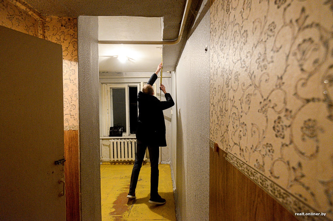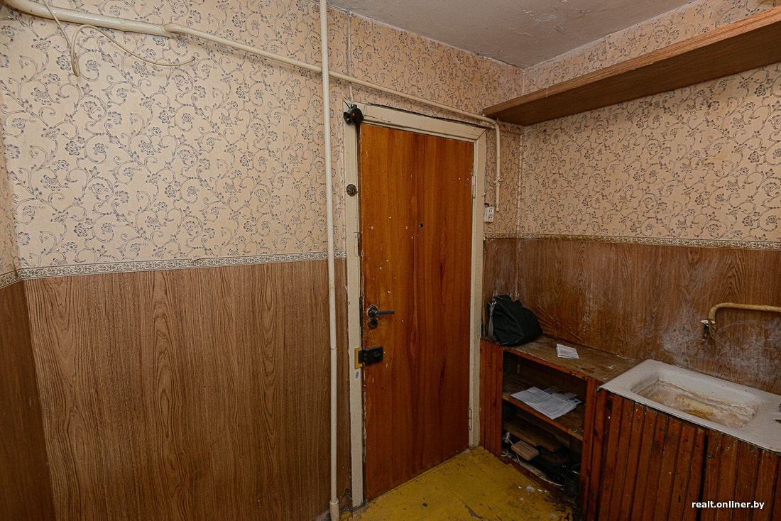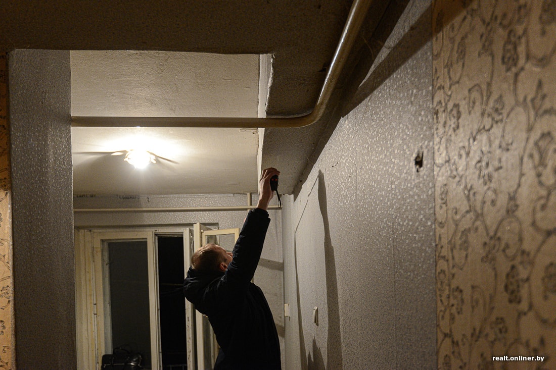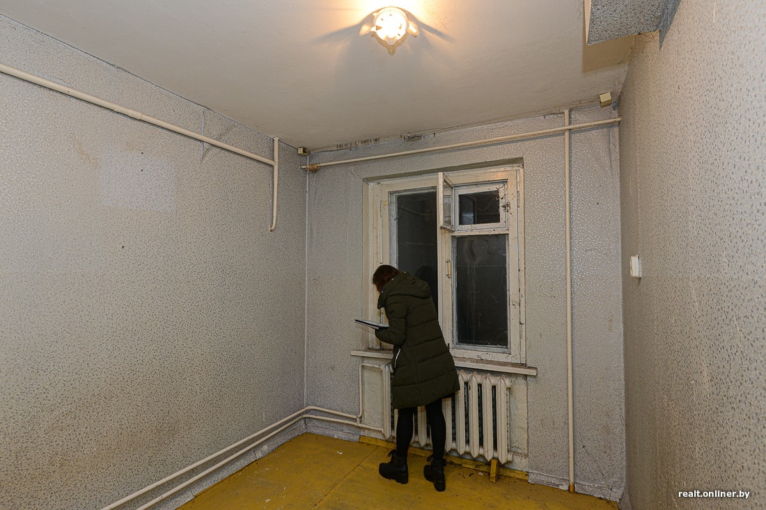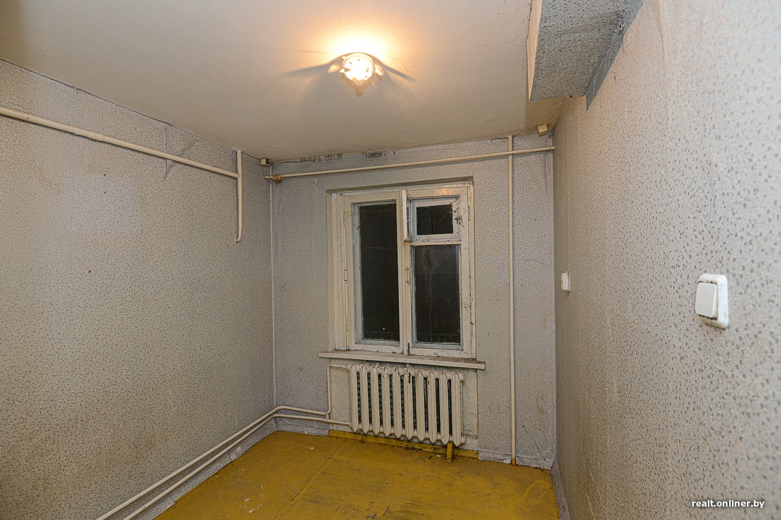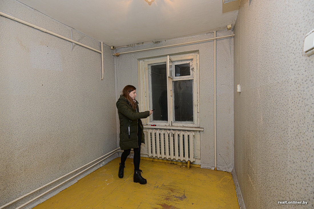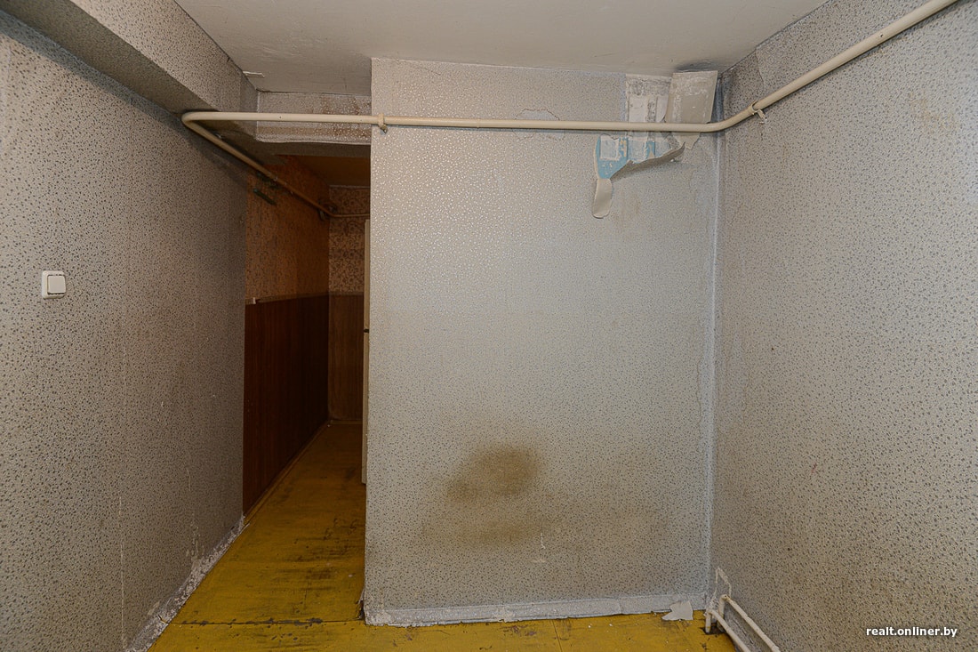 А микростудия, о которой идет речь, находится в обычной панельной девятиэтажке Солигорска. Неизвестно, чем она была до того, как в 2017 году ее выделили в качестве компенсации за снос половины дома. Хозяйка не жила в ней ни дня: просто не нашла способа. Квартира досталась ей в удручающем состоянии: прогнивший пол, разбитый унитаз, старая оконная рама, паутина из труб по всем стенам и потолку. Отдельного внимания заслуживает короб вентиляции, идущий из ниоткуда в никуда. Перед тем как выделить квартиру в качестве компенсации за снос дома, застройщик только покрасил в ней пол и поклеил новые обои поверх старых.