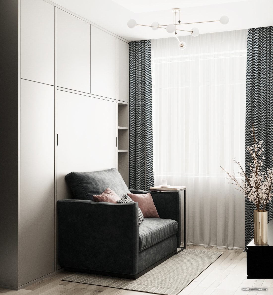 Кроме того, главной затратной частью при создании этого интерьера будут изделия корпусной мебели, которые необходимо делать под заказ. Здесь будут использованы механизмы, которые позволят дверцам не занимать место при открытии, и эти механизмы, к сожалению, стоят денег.