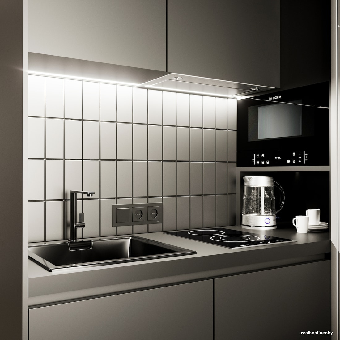 Кухонная зона у нас будет состоять из линейной кухни и барного стола в качестве ее продолжения. Во встроенной кухне будут размещены индукционная варочная панель на две конфорки, духовой шкаф, мойка и ящики для хранения.