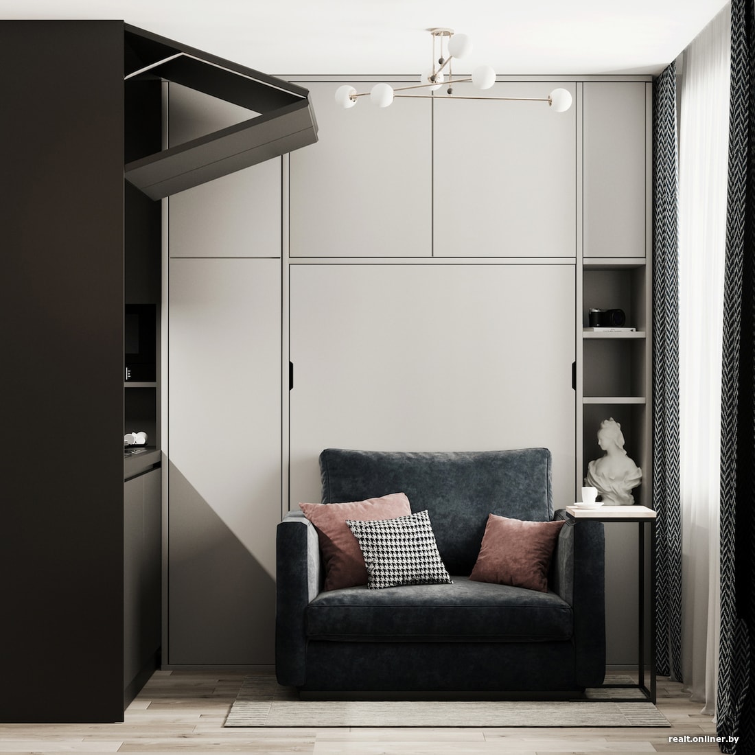В качестве места релакса мы предлагаем использовать небольшой диван габаритами 160×80 сантиметров, а на ночь из стены у нас будет «выпадать» кровать, которая станет полноценным спальным местом. При желании здесь можно обойтись раскладным диваном, но это совсем другой уровень комфорта. Еще один плюс кровати в том, что ее не нужно застилать: вы просто накладываете специальные ремешки на постель и задвигаете ее в стену.