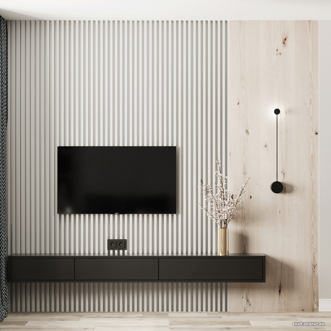 В комнате будет небольшая зона для вещей, где можно будет сложить одежду не по сезону. Но вообще, предполагается, что у жильца будет по одному варианту верхней одежды на сезон. Стену напротив дивана-кровати мы декорируем рейками и повесим телевизионную панель.
