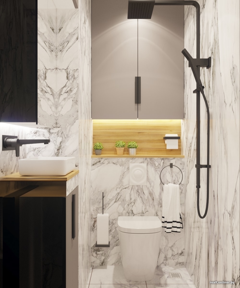 Кроме ниши с умывальником, в санузле будут расположены унитаз со скрытой инсталляцией, а также сток в полу и душевая лейка на потолке. Если вы хотите принять душ, то просто закрываете крышку унитаза и включаете воду. Это, кстати, существенно облегчает уборку помещения.
