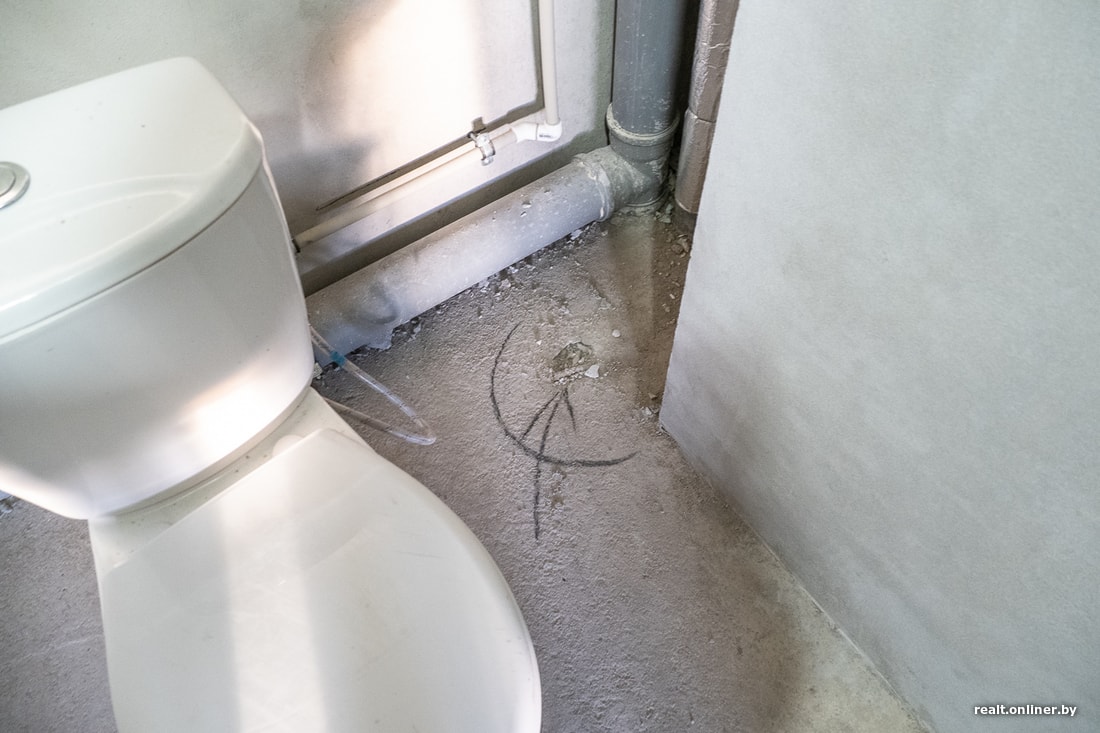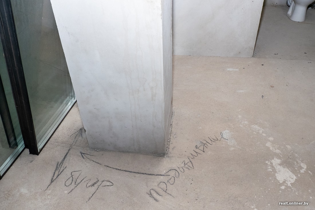 На стяжке также остались бугор и ямка, они лечатся довольно просто, но, как я сейчас слышал, в этом месте вы собираетесь ставить перегородку, а значит, стяжку все равно придется резать. Может, и нет смысла заставлять застройщика переделывать это и задерживать передачу ключей. Решать вам.