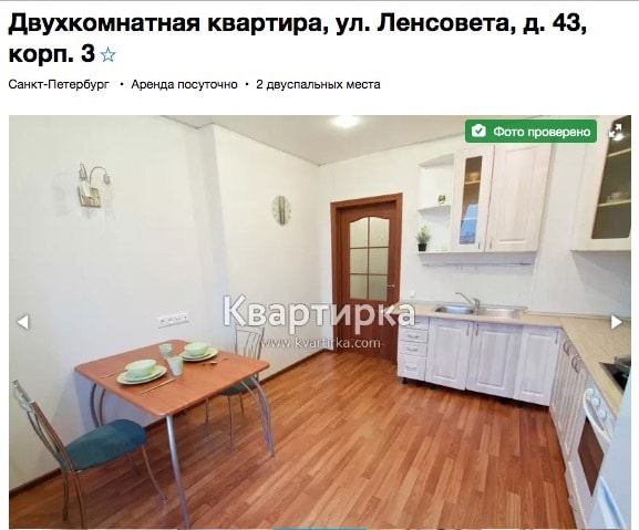 Мы не публикуем фотографии и скриншоты объявления, о котором идет речь, чтобы не портить репутацию площадки свободных объявлений, которая не несет ответственности за каждый размещенный товар. Однако скриншоты с сайта имеются в распоряжении редакции. И если поискать эти картинки в Google, то можно найти несколько объявлений-близнецов. Очень похожая квартира сдается на сутки в Санкт-Петербурге. Только спальня там выглядит иначе.