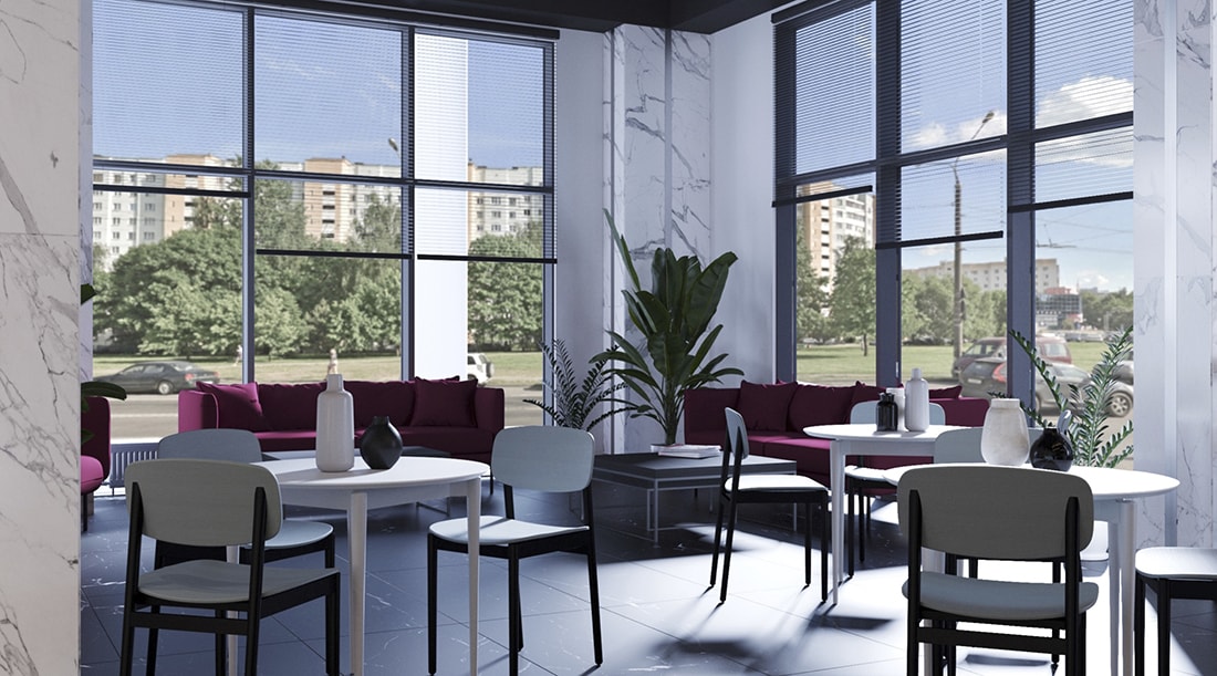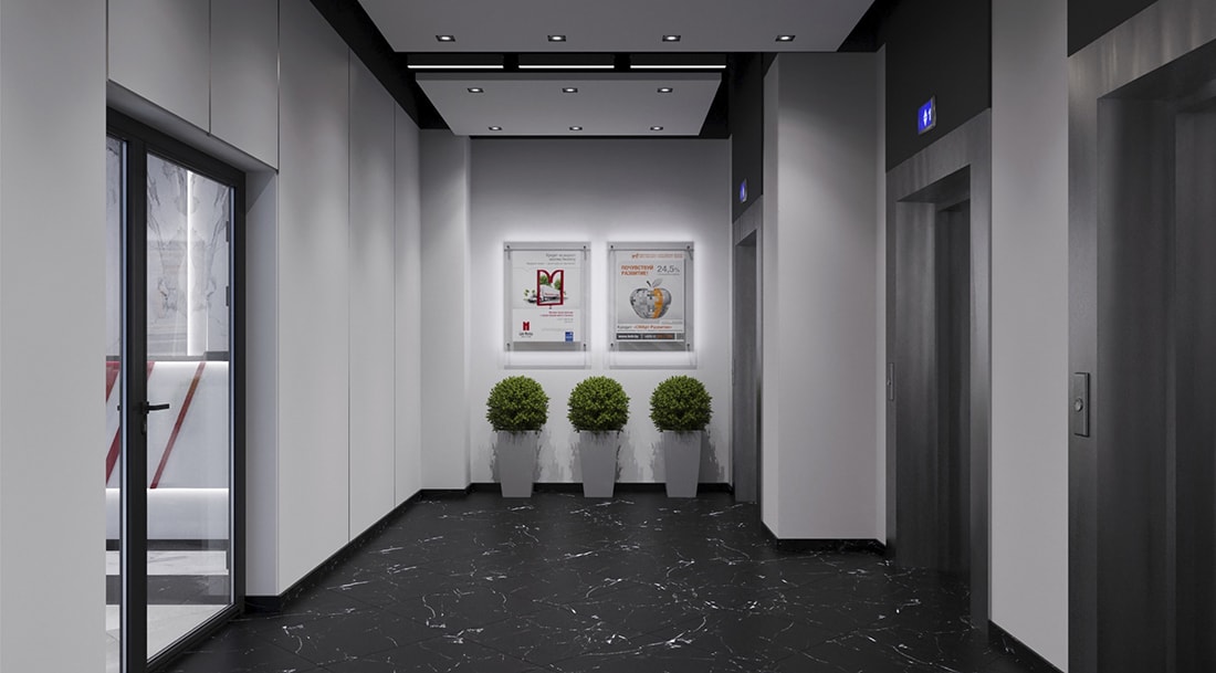 Так сейчас выглядит лобби здания. Наводить красоту в нем будут в последнюю очередь, чтобы «не затоптать», пока ведутся ремонты на верхних этажах. Помимо стойки ресепшен здесь предусмотрены места для отдыха и кофе-паузы. Доступ посторонних лиц в здание будет ограничен: пропускная система отделит «своих» (для них двери будут открыт 24 часа в сутки) от «чужих».