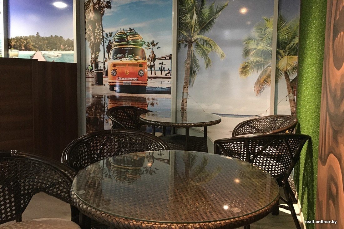 Кафе заняло всего 27 кв. м и граничит с торговыми площадями на цокольном этаже дома №24. Интерьер, скажем прямо, недорогой. На стенах — искусственный газон и граффити, напротив кассовой зоны установлено несколько столиков с плетеными стульями. Тесно.