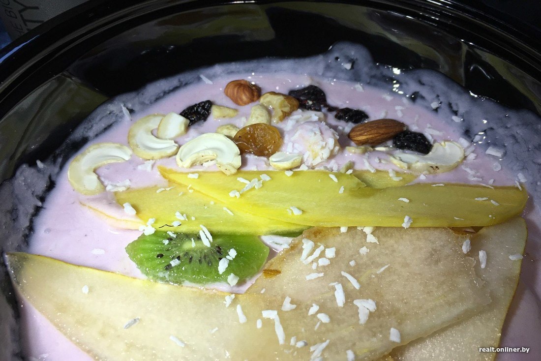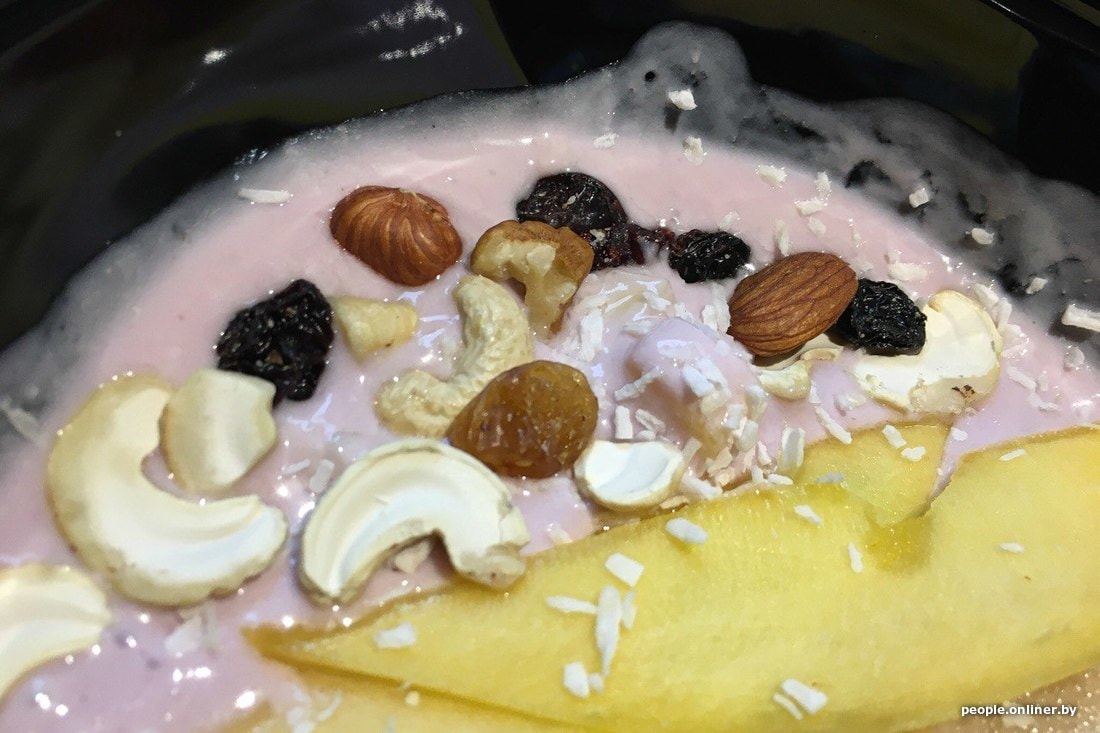Боул с манго — квинтэссенция мема «ожидание — реальность». На фото — мисочка с выложенными под линеечку фруктами и орешками, играющими всеми цветами здорового образа жизни. В реальности — йогурт, в котором утопают нарезанные неперфекционистом фрукты. Все равно вкусно, но… Кстати, в боуле не было заявленной гранолы и граната.