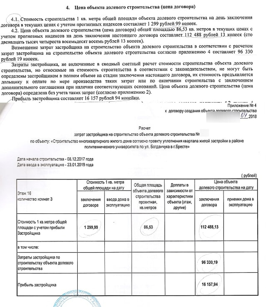Вчера мы бросили клич и попросили всех, кто пережил долевое строительство, прислать отдельные пункты своих договоров, дабы выяснить, сколько же из уплаченных нами немалых сумм идет непосредственно на возведение дома, а сколько оседает (с некоторыми оговорками) в карманах застройщиков в виде прибыли. Благо, в отличие от держателей жилищных облигаций, дольщики этой информацией располагают. Большое спасибо всем, кто откликнулся и обнародовал свои документы. На основе этих данных мы составили довольно показательную таблицу.