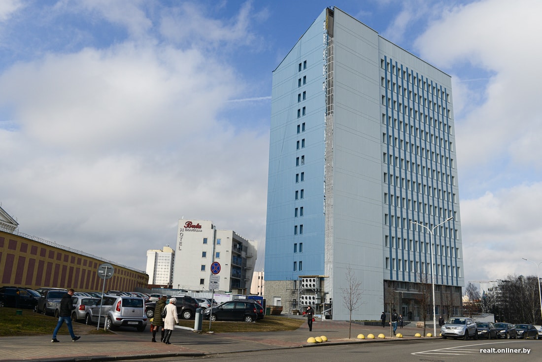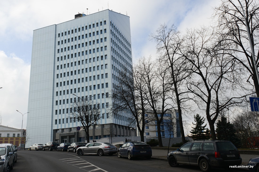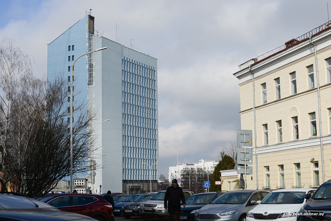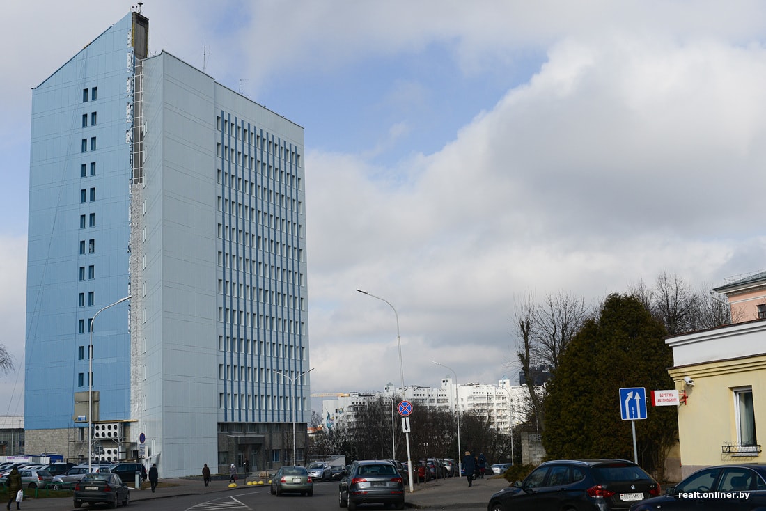 До 2020 года высотка Государственного комитета судебных экспертиз в центре города внушала страх и уважение. Построенная в стиле советского брутализма, она давила низкоэтажную застройку Городского Вала своим ростом и удручающей серостью. Был в этом хмуром облике свой узнаваемый шарм и характер, ведь не все здания города должны дарить радость и позитивчик. Но летом началась модернизация фасада, а в декабре брутальное здание в центре Минска уже вовсю облицовывали небесно-голубым алюминием. Сейчас работы почти завершены и самое время оценить, как высотка смотрится в новой «одежде».