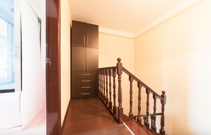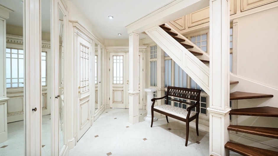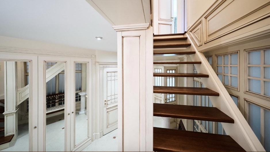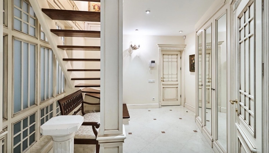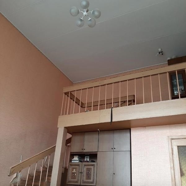 А так выглядит другой «пентхаус» в доме на Казинца — здесь сохранилась аутентичная советская отделка, в том числе лестница на второй свет в гостиной. Пусть это смотрится не так нарядно, как с современным ремонтом, зато позволяет составить представление о том, как эти квартиры-дворцы выглядели в советское время.
