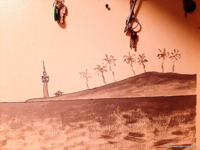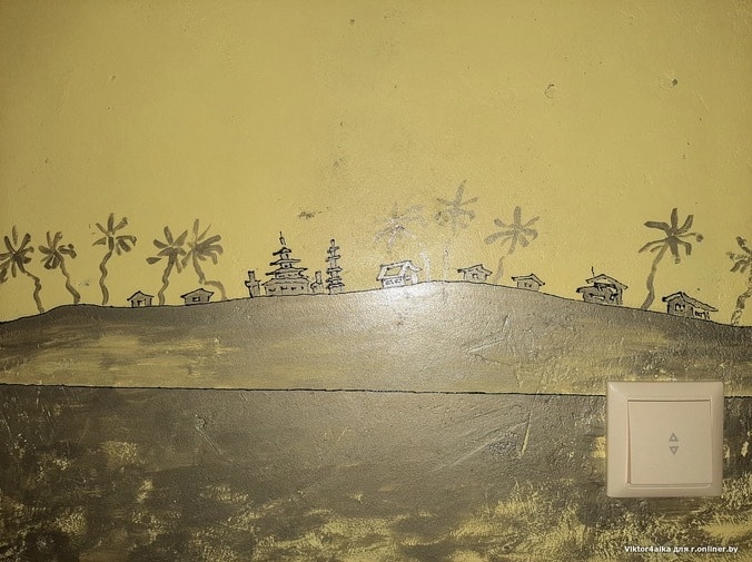 Площадь квартиры почти 50 «квадратов». Есть кухонная мебель, холодильник, плита, интернет. Но все это мелочи. Главное — художественная роспись помещений. Одну из спален, а также коридор, санузлы и кухню собственник разрисовал на разные мотивы. Оставим разговоры и описания в стороне, лучше посмотрим, сколько труда было вложено в обновление стен и потолков.