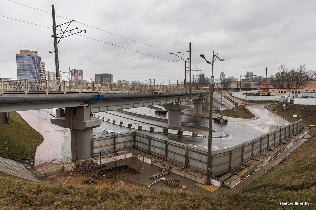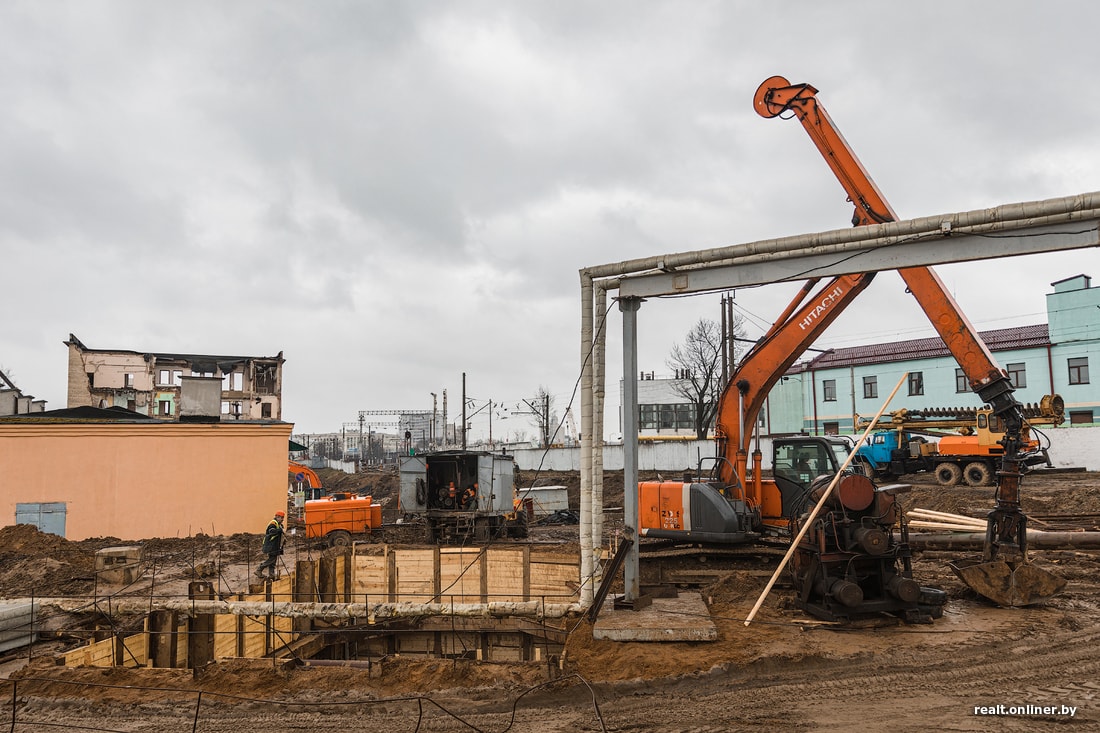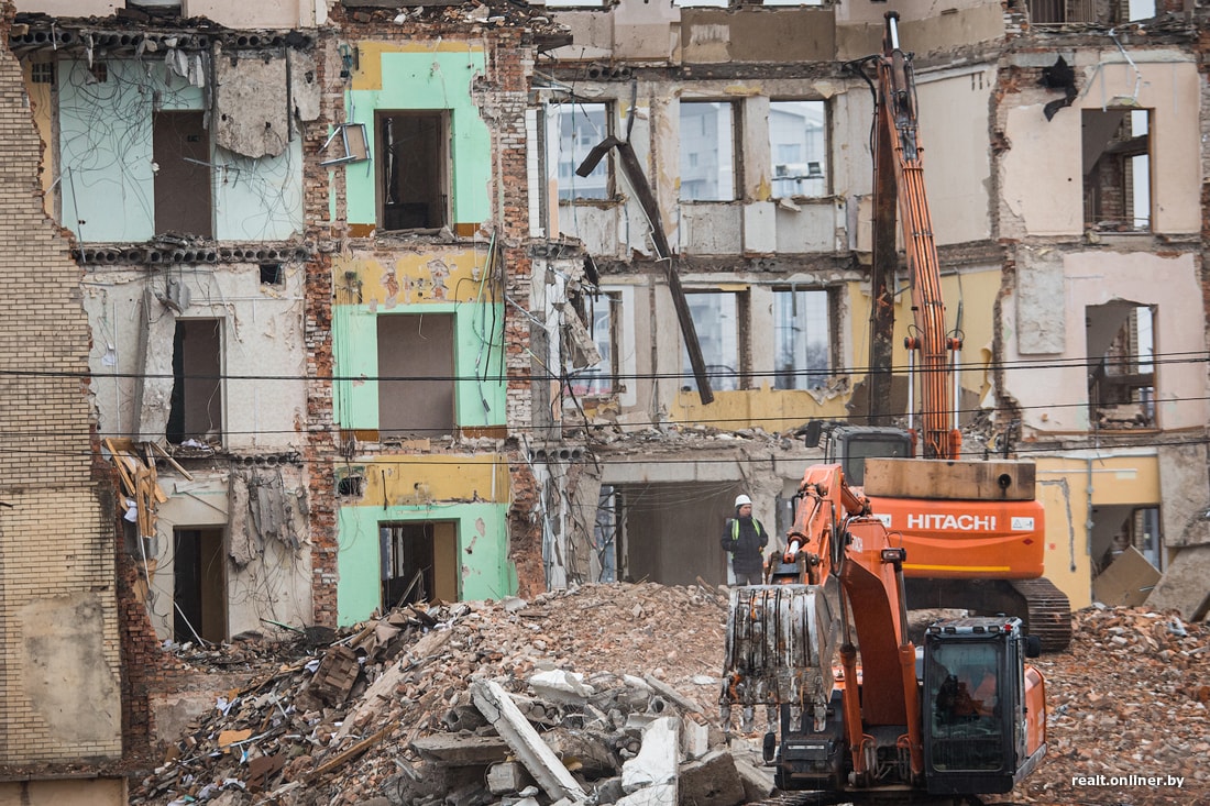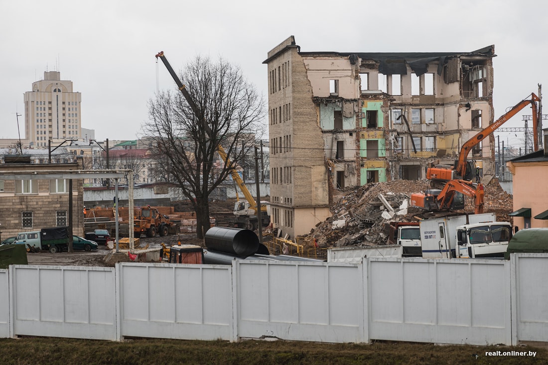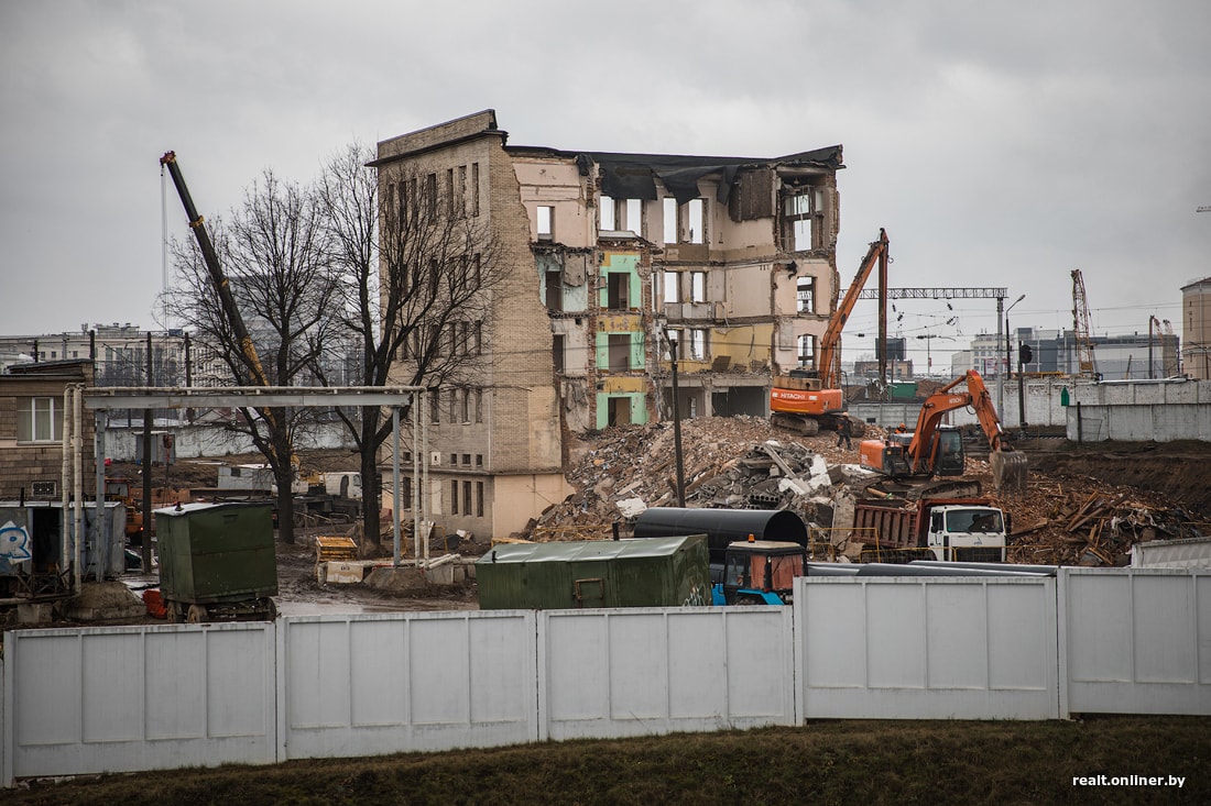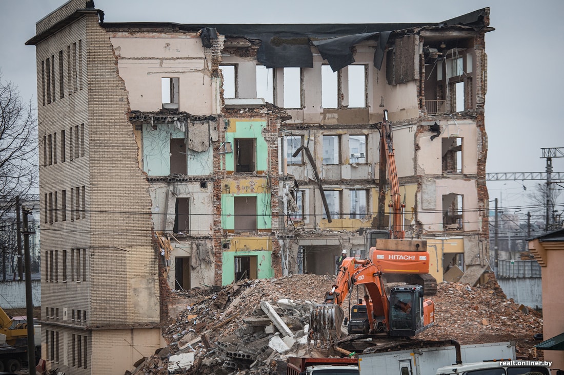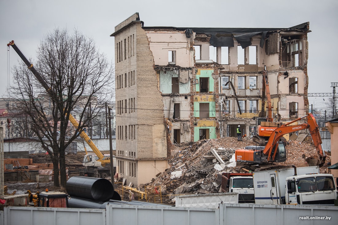 Этой пятиэтажке не повезло разорвать первое транспортное кольцо, встав между Домашевским переулком и улицей Толстого. Сейчас на будущей стройплощадке участка первого кольца работает тяжелая техника — ломает стены и перекрытия административного здания по адресу проспект Дзержинского, 1а, которое принадлежало Белорусской железной дороге. Помимо него, под бульдозер угодят 47 строений, которые необходимо снести, чтобы замкнуть участок дороги между Домашевским переулком и улицей Толстого.