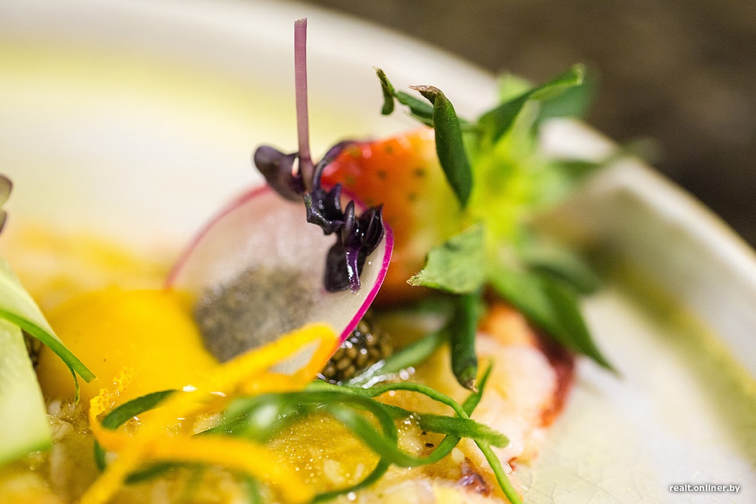 Сегодня пельмени он готовить не стал и остановился на карпаччо из лобстера с тартаром из огурца и копченой клубники, геля из манго и икры из семян чиа. Стоит такое блюдо 200 рублей.
