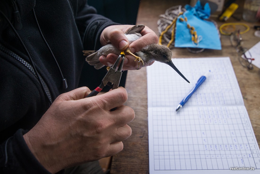 Это утро принесло двух мородунок, травника, малого зуйка и трех белохвостых песочников. Пойманных птиц взвешивают и измеряют (полученные таким способом данные потом заносят в международную базу), прежде чем надеть на них метку с индивидуальным кодом. Она является чем-то вроде паспорта: если пернатый попадется снова, то можно будет узнать много важной информации о нем. Цветные пластиковые кольца еще больше упрощают задачу, ведь достаточно запомнить их комбинацию, чтобы узнать, где и когда была помечена конкретная особь.