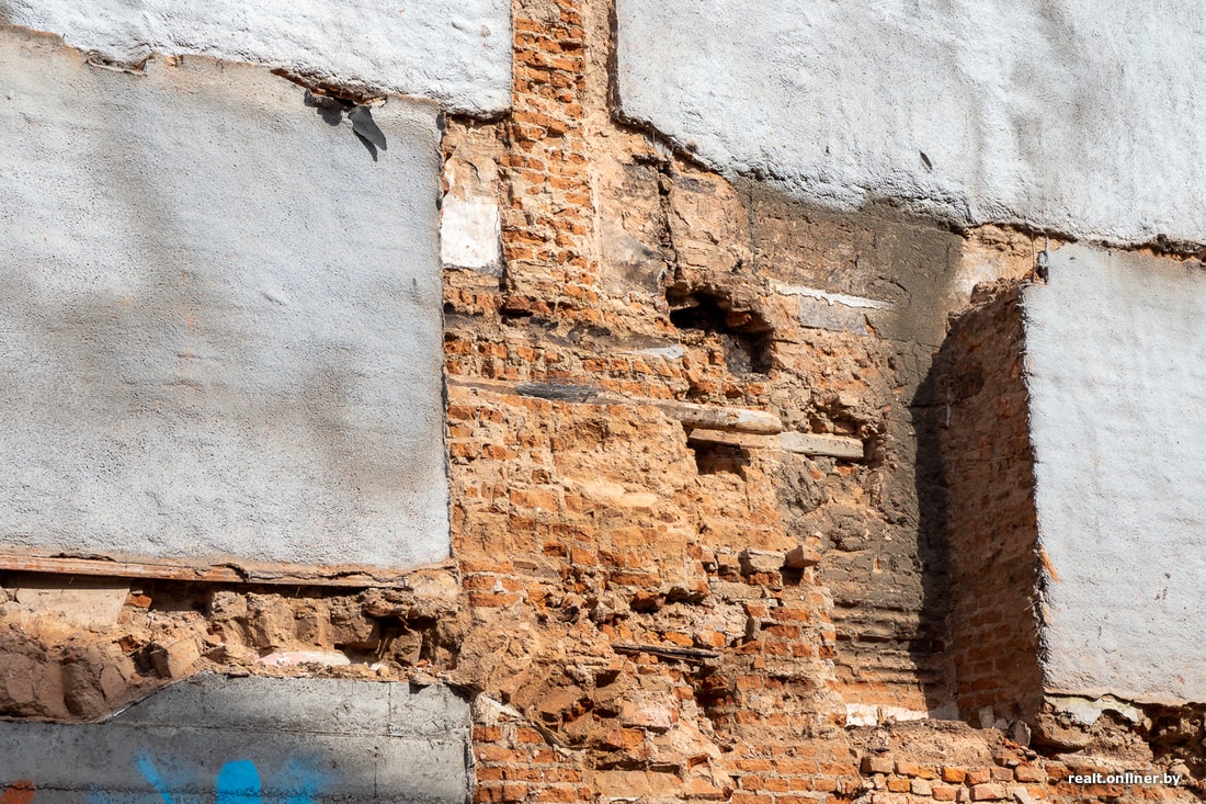 За последние дни работы на объекте ускорились, и вот, что сейчас могут видеть минчане, гуляя по центру города: от здания на восемь окон на фасаде (в длину) остался только «обрубок». Все остальное разрушено. У нас пока еще есть возможность оценить толщину кирпичных стен, построенных в конце XIX века и разваленных в XXI.