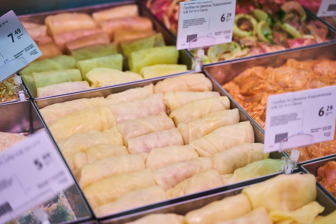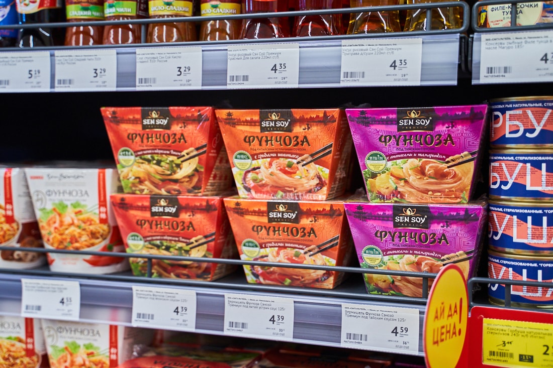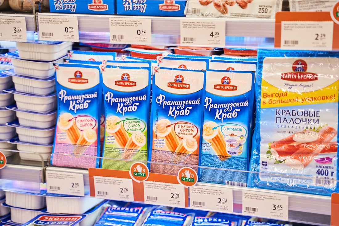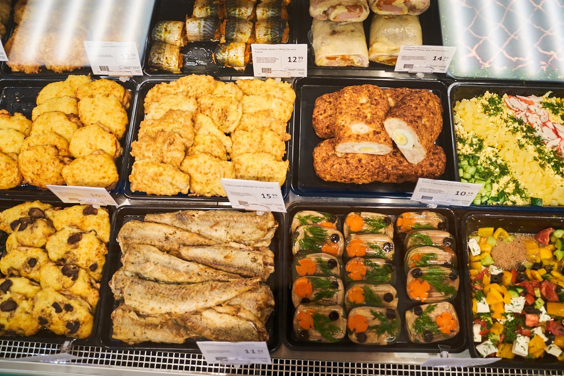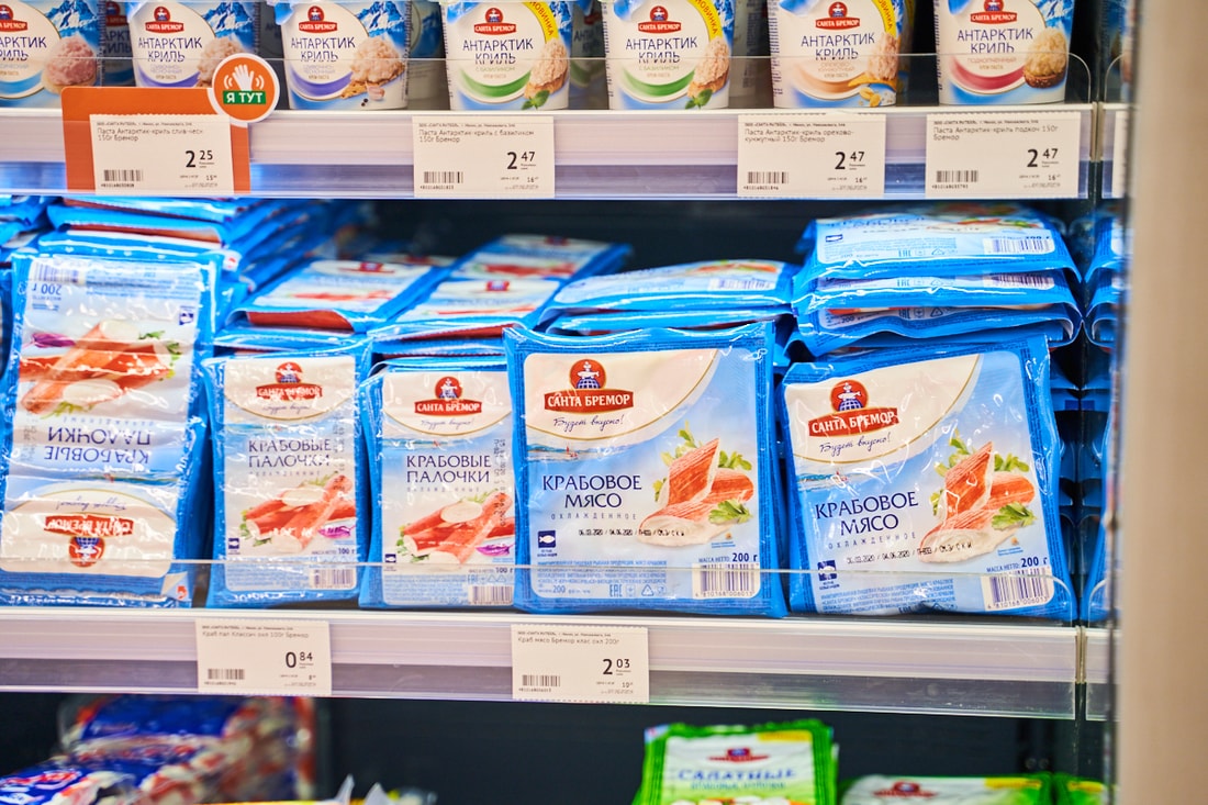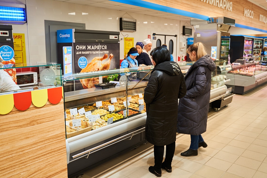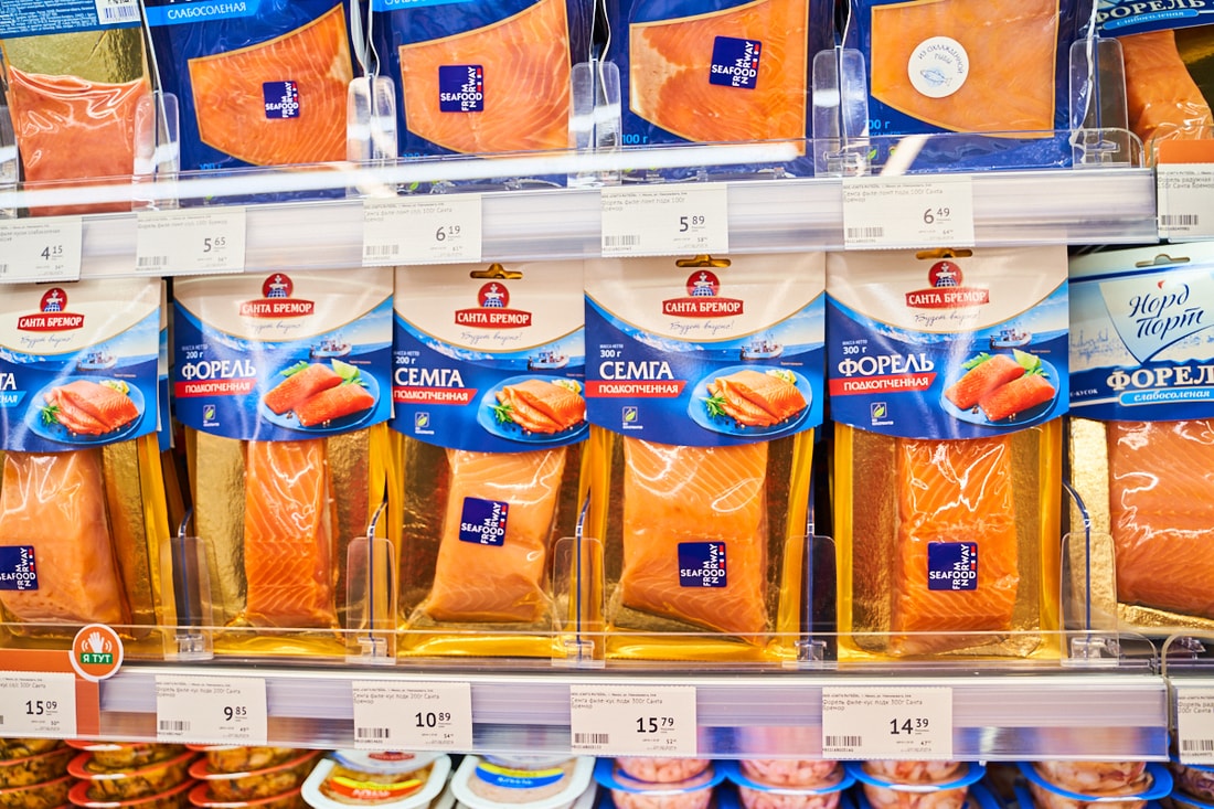 В супермаркете представлены десятки видов замороженной рыбы из Скандинавии, мясные и куриные полуфабрикаты собственного производства.