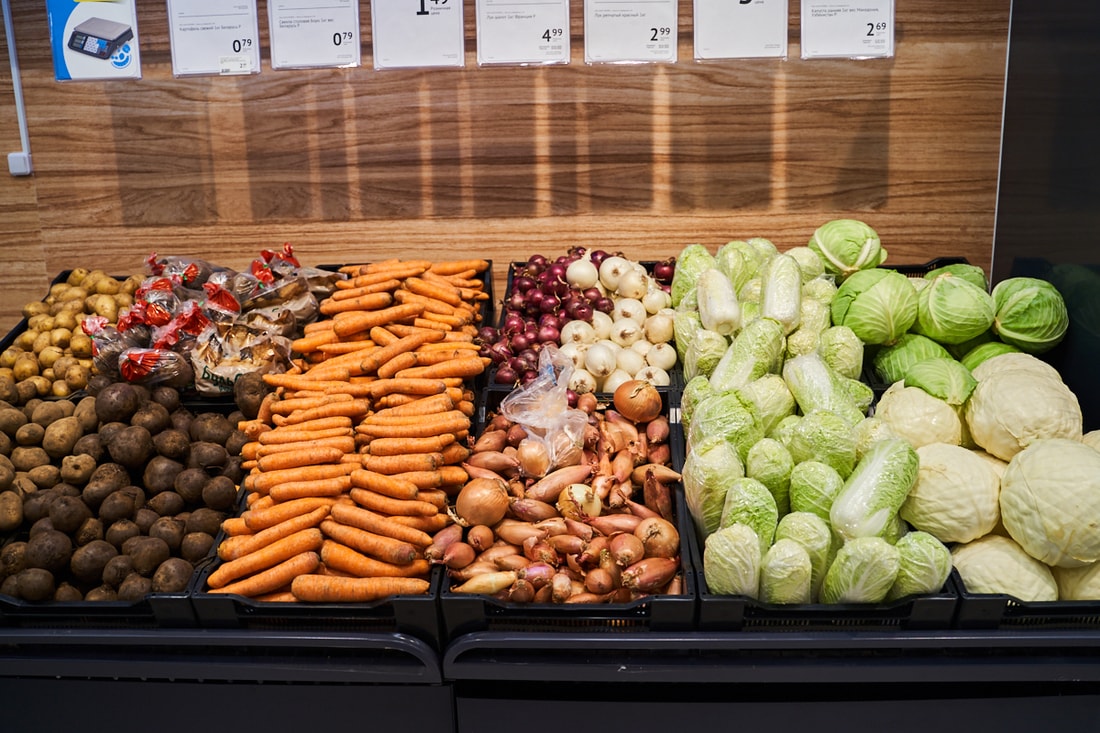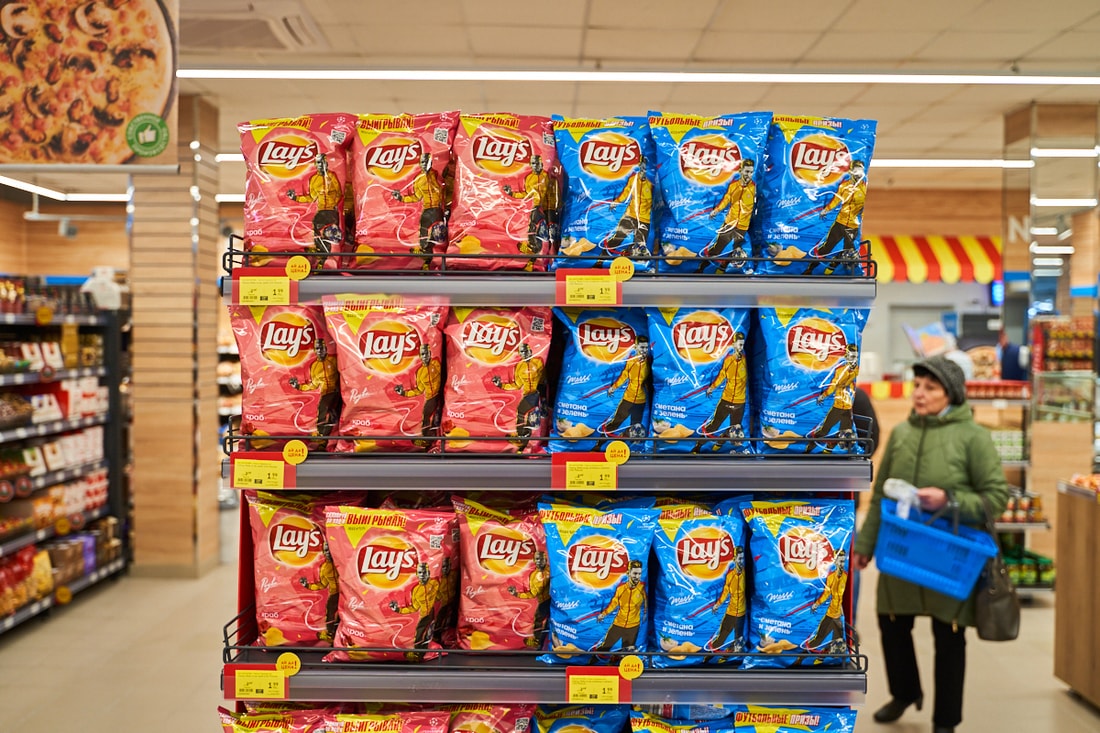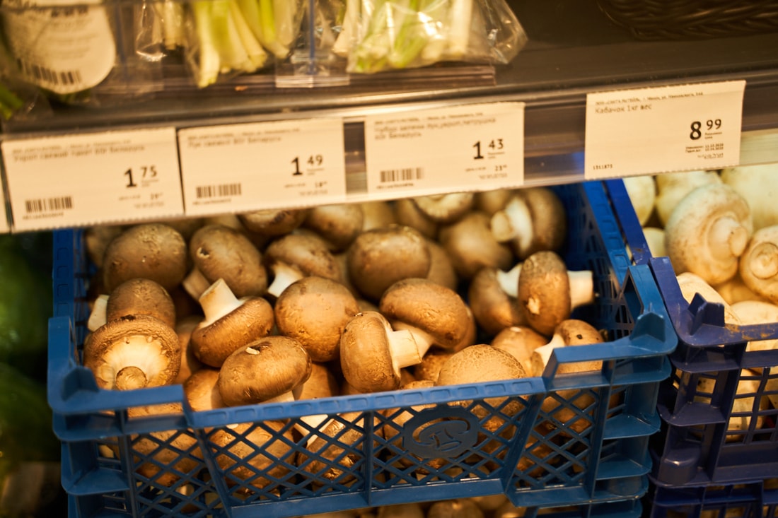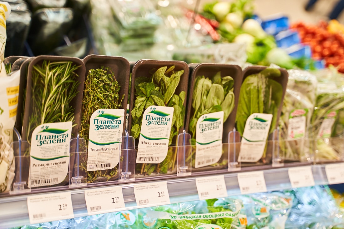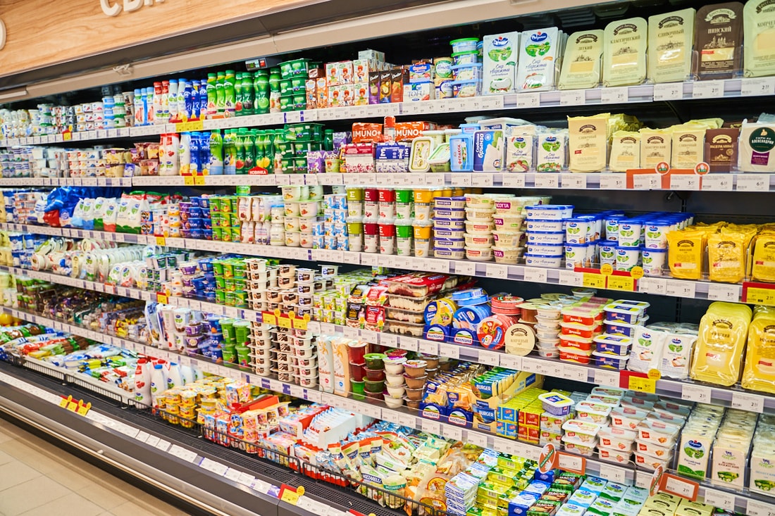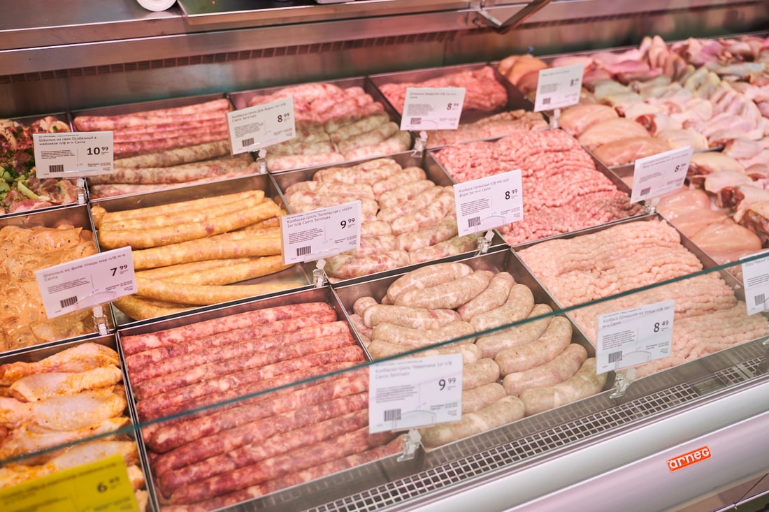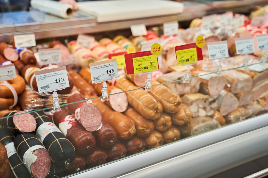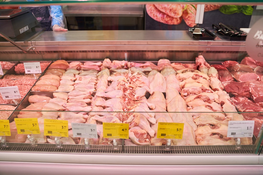 В супермаркете представлены десятки видов замороженной рыбы из Скандинавии, мясные и куриные полуфабрикаты собственного производства.