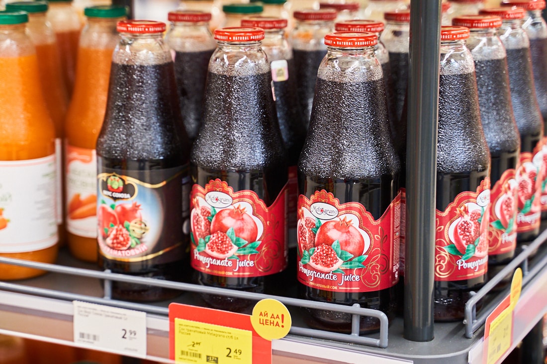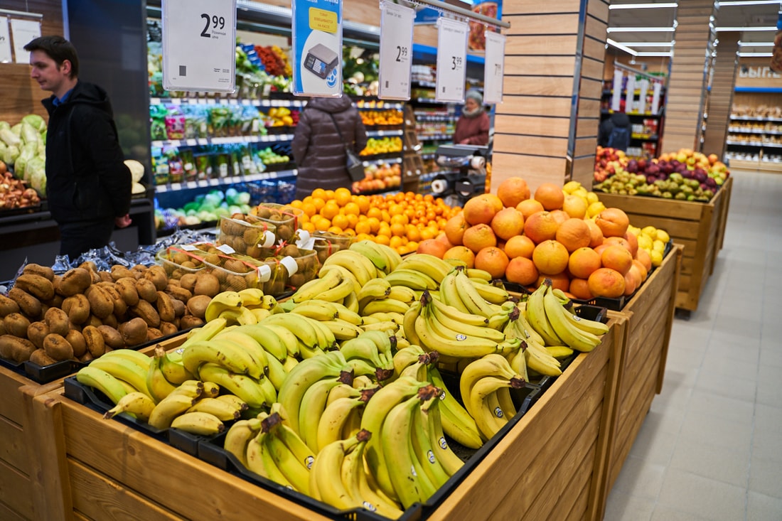 Торговый зал супермаркета «Санта» площадью 700 «квадратов» вмещает почти 19 тысяч наименований товаров — вдвое больше, чем в обычных магазинах. Видное место у входа отвели под фрукты и овощи. Много и бакалеи: круп, макарон, консервов, подсолнечного масла, разных видов чая и кофе.