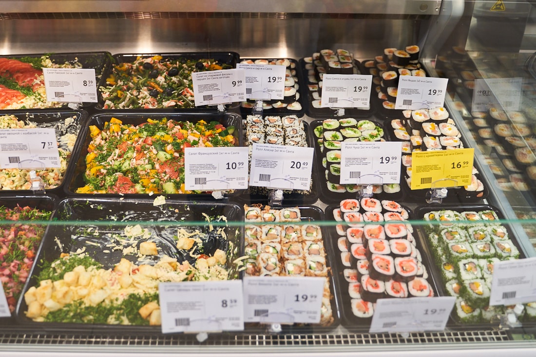 Вокруг магазина есть офисы, что формирует спрос на еду в формате Food-to-Go, поэтому в супермаркете предусмотрена зона с готовыми блюдами: салатами, котлетами, суши. На гриле жарится цыпленок, а выпечка поступает из пекарни при магазине. Есть и своя итальянская пиццерия.