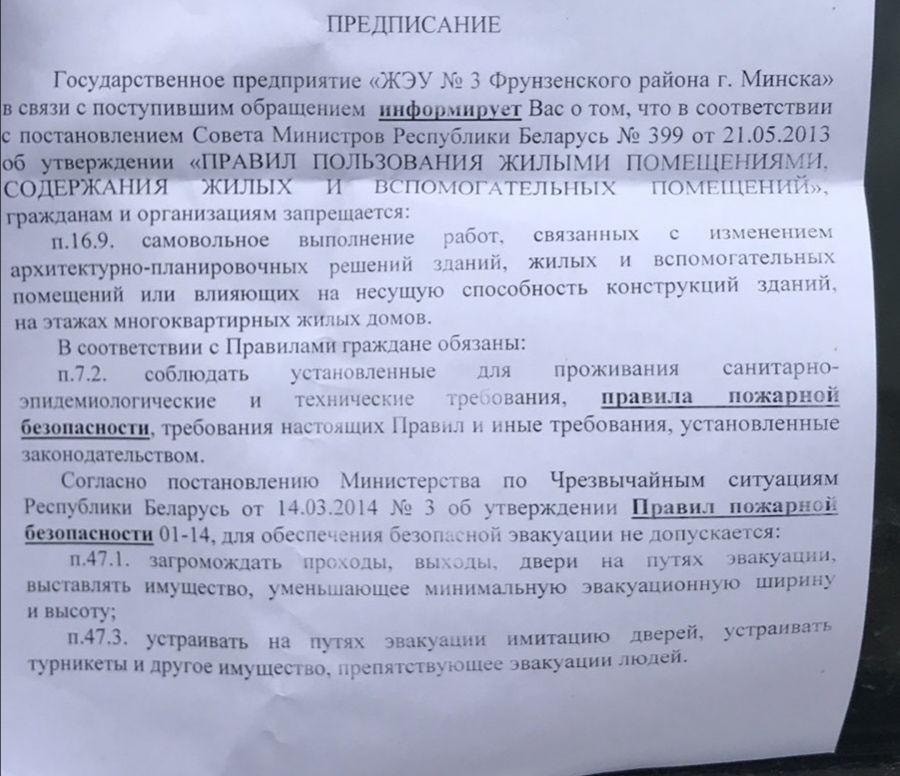 По закону минчане, решившие присоединить часть территории подъезда, действительно не правы. Чтобы оформить все официально, надо обойти всех 609 соседей-собственников (а не только по площадке) и получить согласие подавляющего большинства. Потом нарисовать проект, заверить его во всех причастных инстанциях и только после этого приступать к возведению перегородок. Но с другой стороны, не видит ли ЖЭС соринку в чужом глазу, забывая о бревне в собственном?