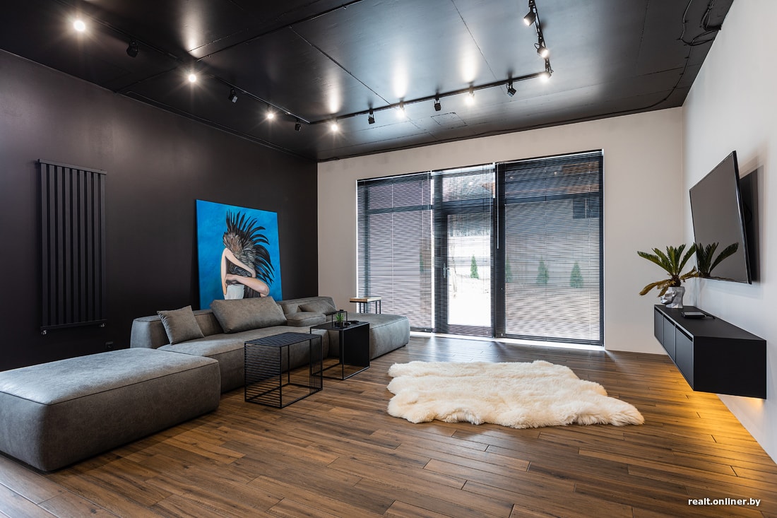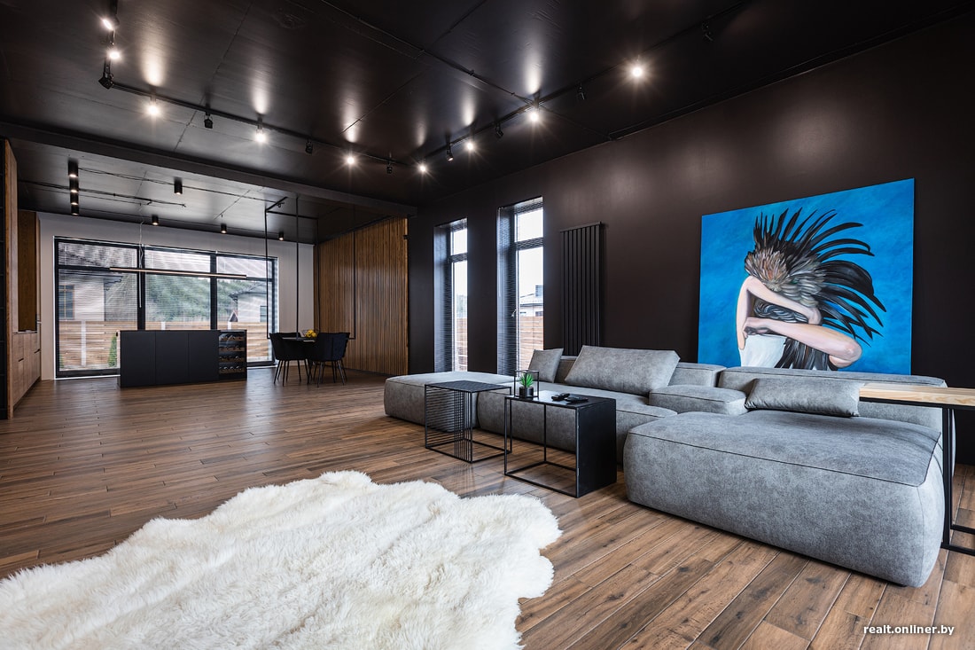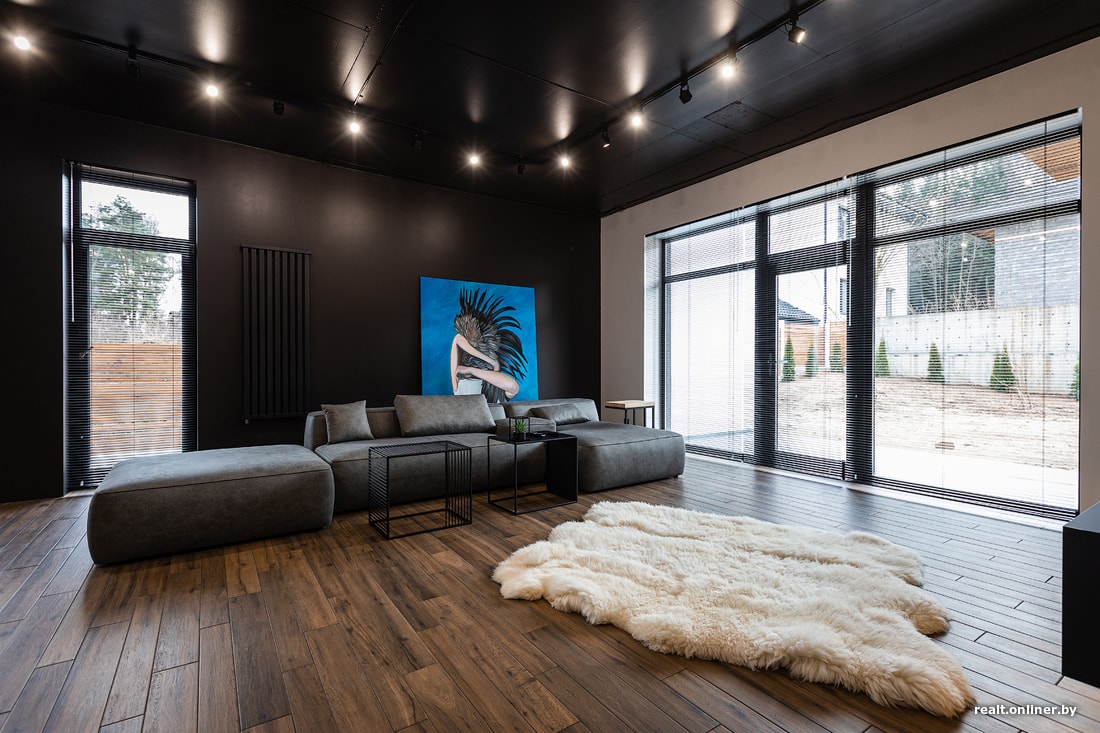На первом этаже расположились гостиная с кухней, тренажерный зал, теплый гараж со входом в дом, санузел и топочная. Собственник выбрал брутальный и сдержанный стиль с минимумом мебели и предметов интерьера. Бетонный потолок просто покрашен в черный цвет, на полу лежит испанская плитка, отапливаются помещения черными дизайнерскими радиаторами.