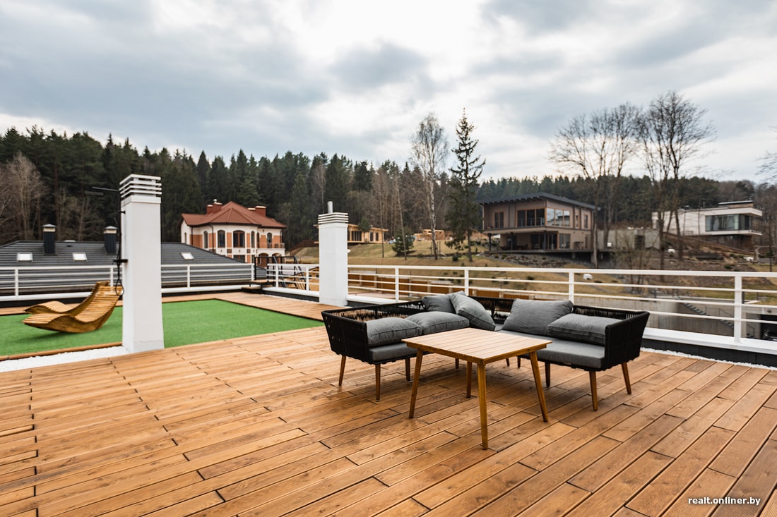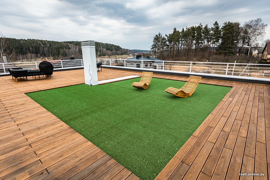 Выходим на эксплуатируемую крышу, обшитую лиственницей, и видим шезлонги, искусственный газон, кресла и барбекюшницу.