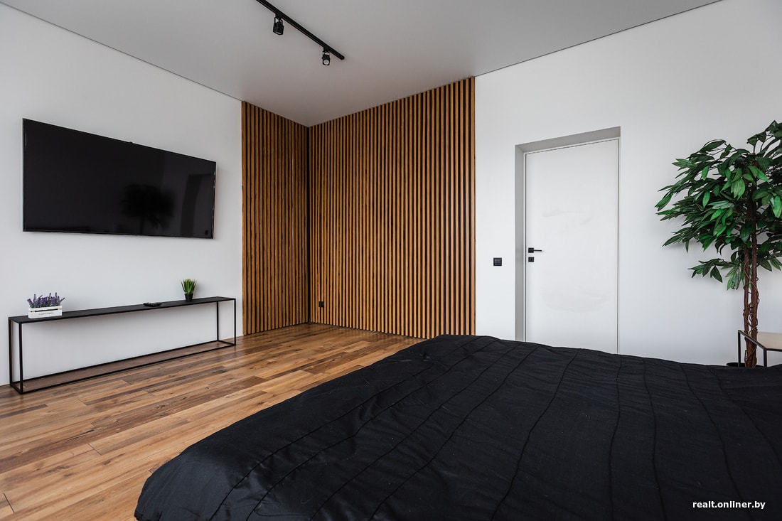 К концу года на участке уже стоял современный черно-белый дом с актуальной сегодня отделкой из натурального дерева. Полностью работы были закончены еще через несколько месяцев.