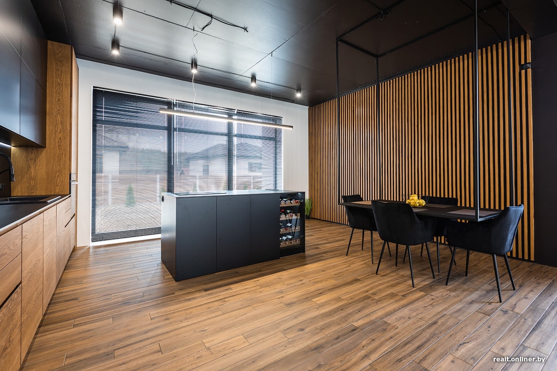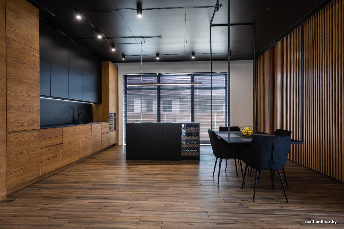 В центре кухни находится островок с винным шкафом. Слева — сделанная под заказ кухня из дубового шпона. Обеденный стол крепится к потолку при помощи металлического каркаса.