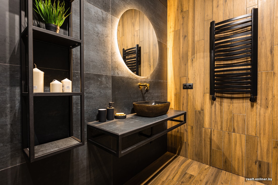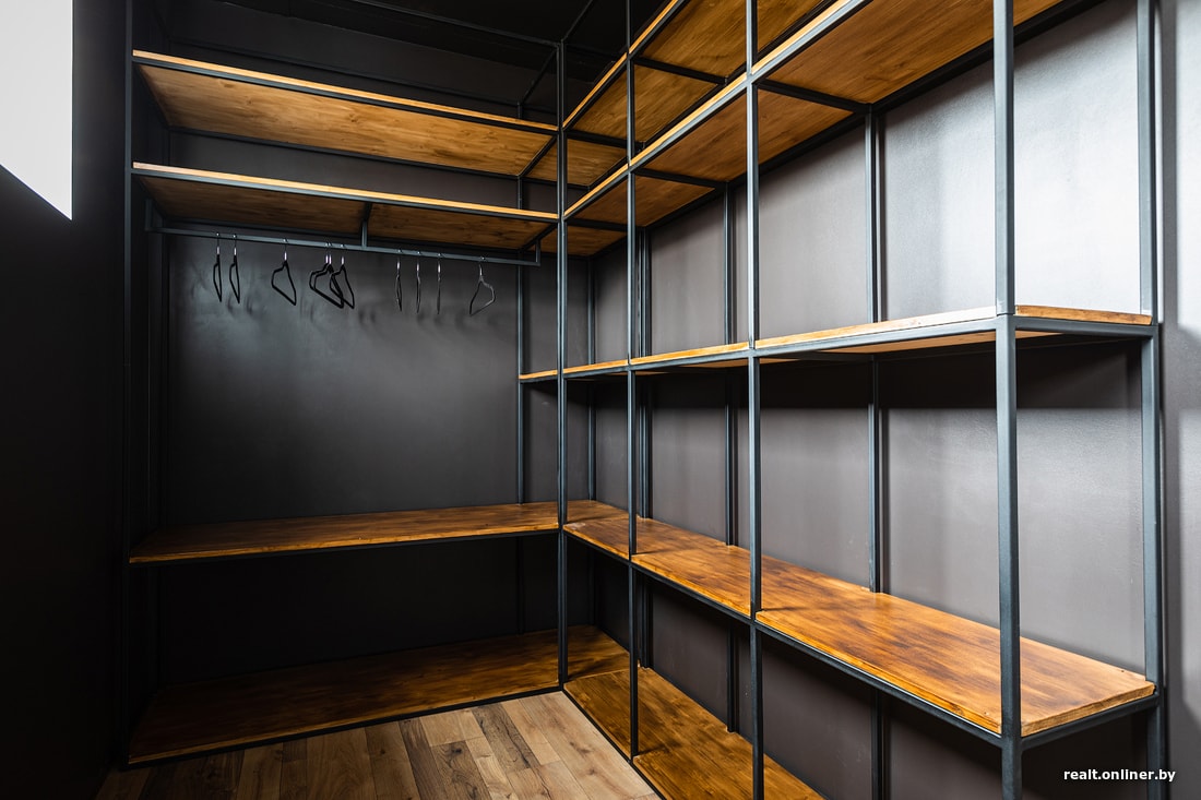 Из брутального санузла можно попасть в топочную — дверь спрятана в конструкции из реек.