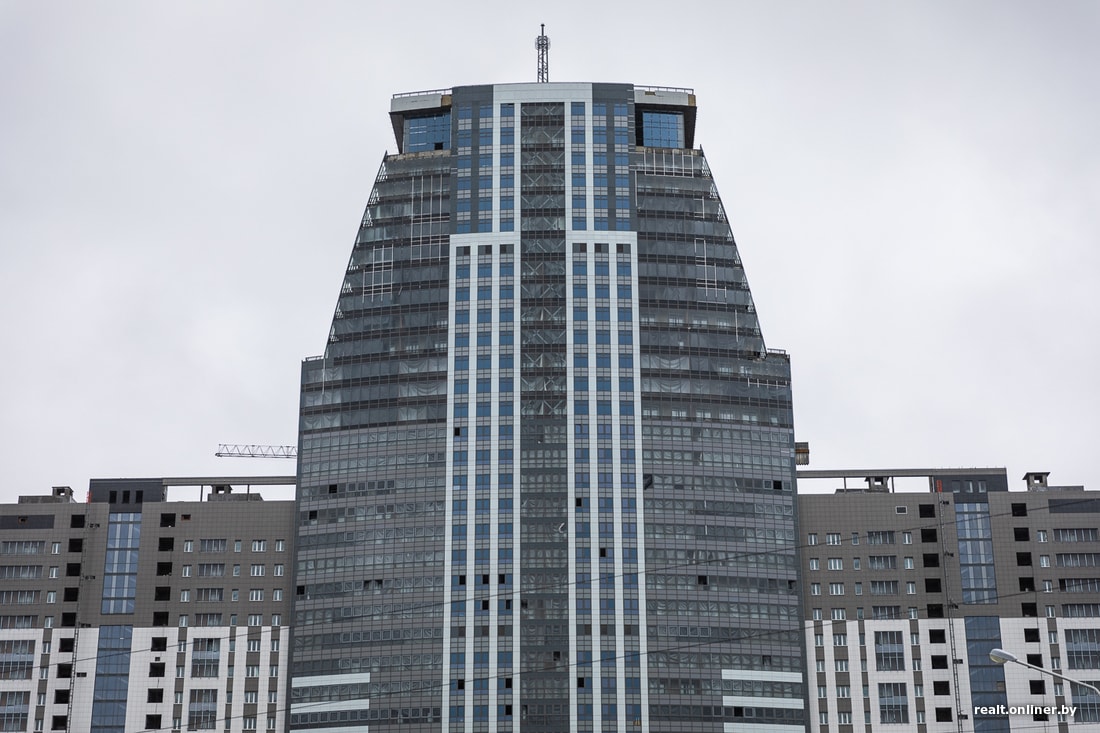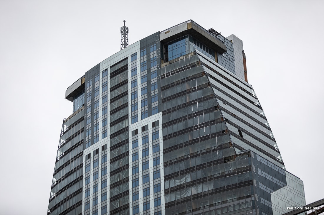 Уходит эпоха. Долгострой, который развязали еще при Ладутько, обрел свои окончательные черты. С 2011 года, а именно тогда была заложена капсула с посланием потомкам (интересно, что в ней, — о том, как надо строить и с кем сотрудничать?), амбициозный проект претерпел многочисленные изменения. Современные, обтекаемые формы, сплошное остекление, модная подсветка и даже водопад у подножия уступили место «рубленому» экстерьеру без излишеств в мрачноватых цветах. Да и достраивал здание уже не российский бизнесмен, а наш родной УКС Мингорисполкома.