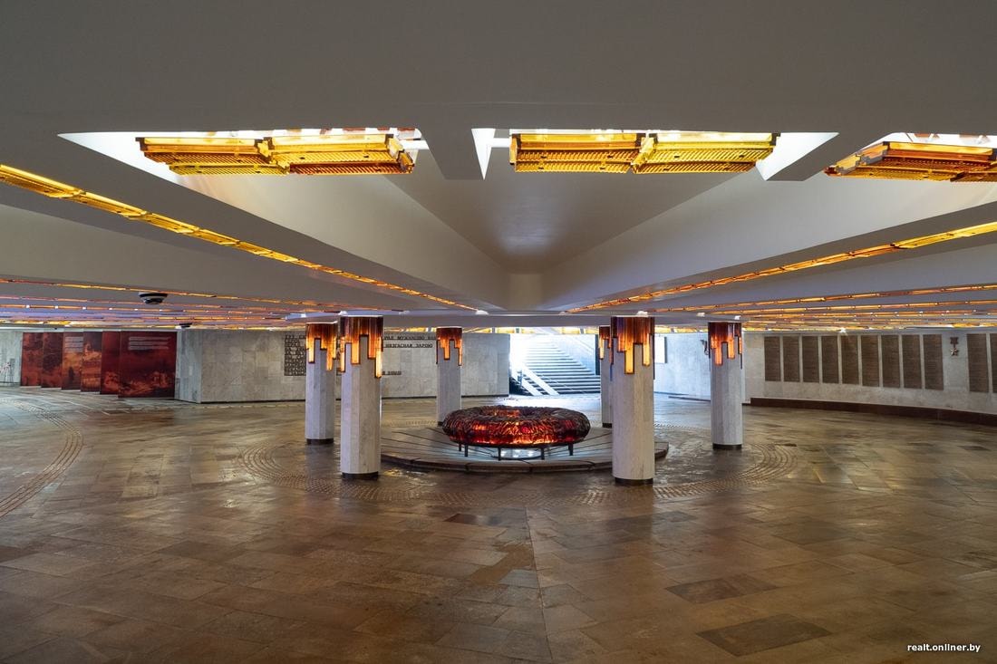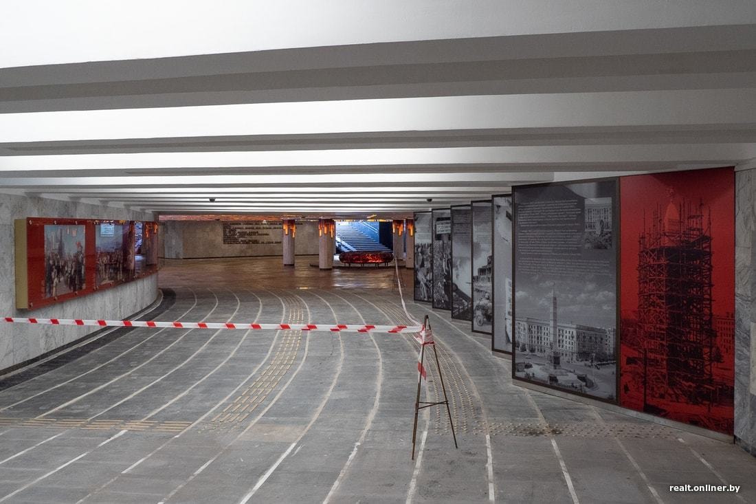 Эти деньги пошли на реконструкцию обелиска, ограду ритуальной площадки в подземном переходе, установку стеклянных дверей и скамеек внутри пространства-музея. Стены в переходе задекорированы панно о войне. Эти фото сделаны в апреле, за месяц до завершения реконструкции.