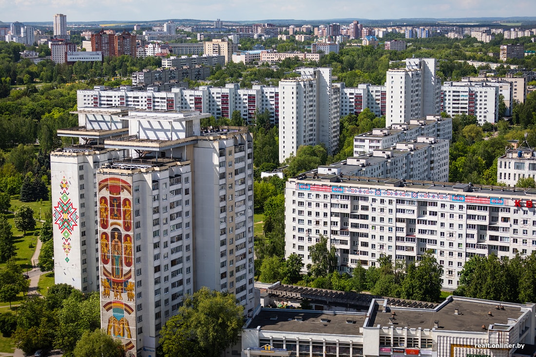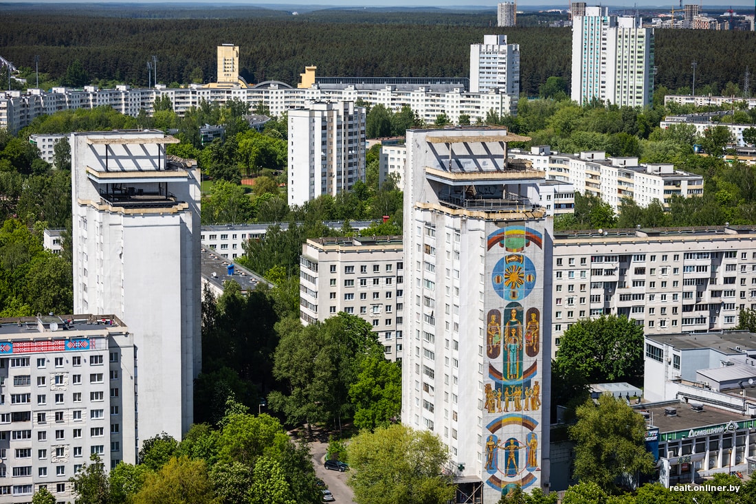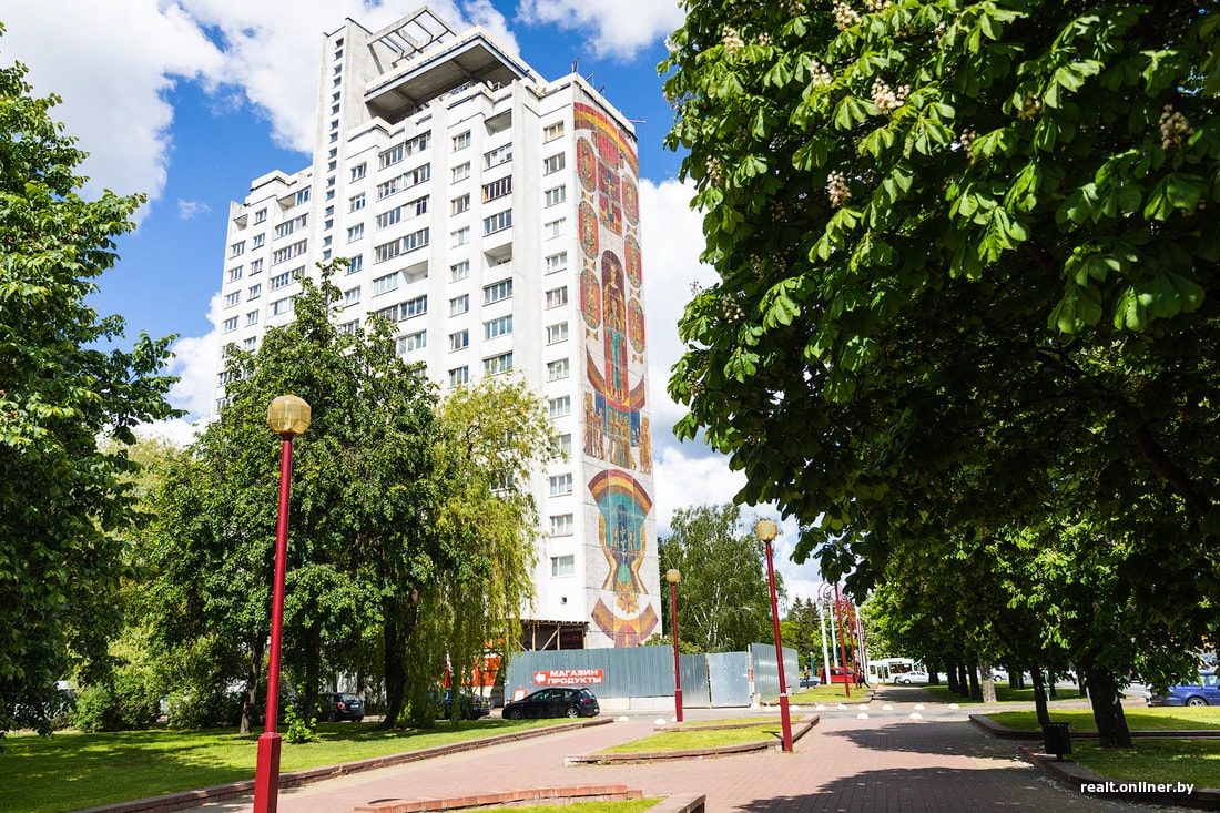 Когда мы произносим слово «восток», первыми в мыслях всплывают «открыточные» виды на высотки, стоящие на первой линии проспекта Независимости: четыре 16-этажки с мозаикой на торцах. Это были не просто дома, а настоящий вызов индустриальным домостроительным технологиям 70-х. В то время, когда новые районы застраивались максимум 9-этажками (порой неприлично длинными), архитекторы Г. Сысоев, И. Попова, И. Журавлев рассчитали, как в рамках стандартных панельных конструкций нарастить дополнительные уровни.