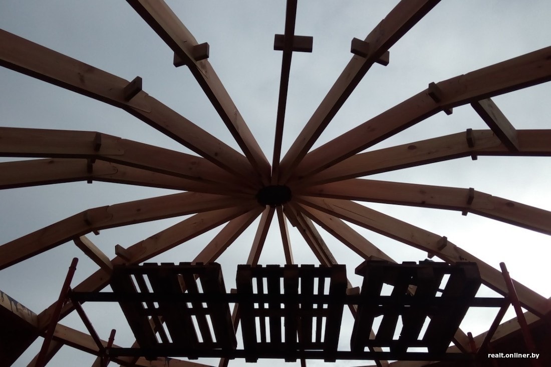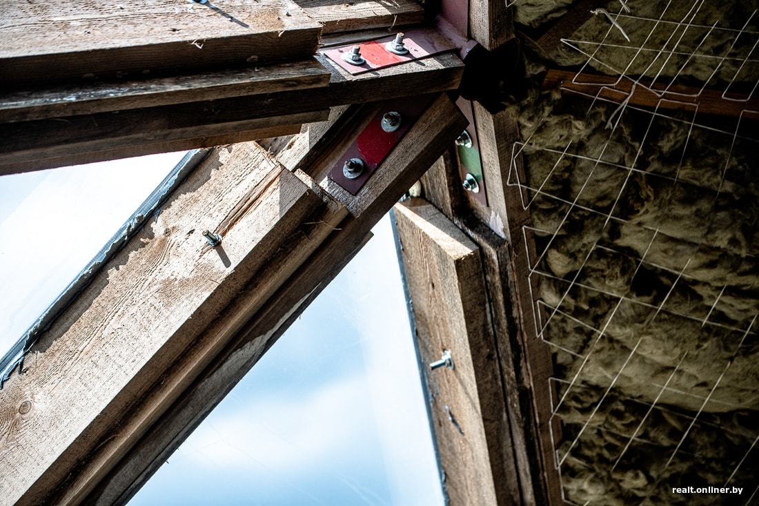 — Проект на купольную крышу основного дома я заказал у витебского архитектора, который ими занимается. Это кажется, что весь купол состоит из одинаковых треугольников. На самом деле здесь шесть типоразмеров деревянных балок и столько же видов металлических крепежей.
