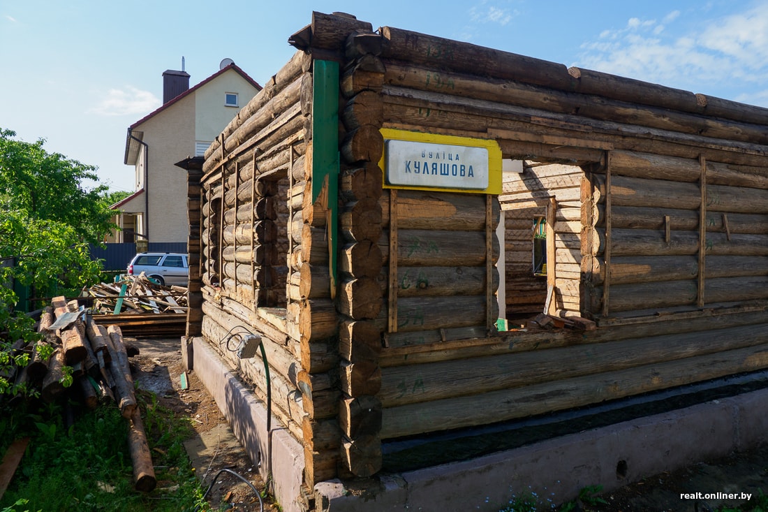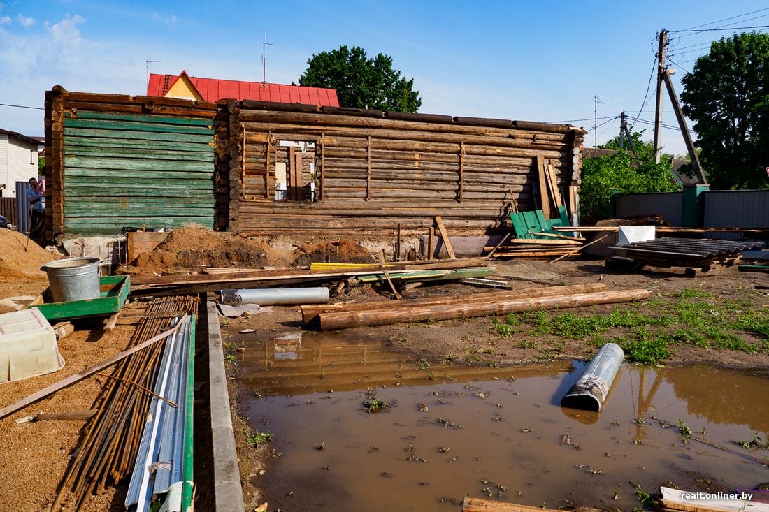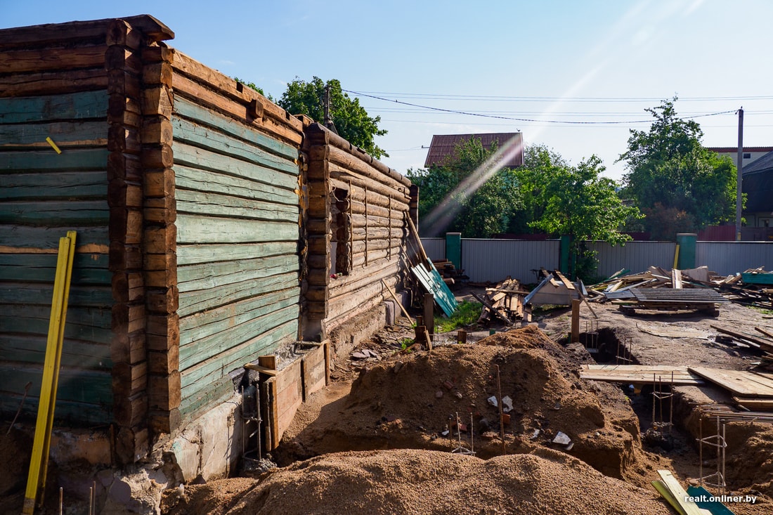 На время реконструкции пара переехала к родителям — все же выгоднее, чем снимать квартиру, а сэкономленные деньги лишними не будут. Сейчас крыша снята, от дома остался только сруб и фундамент. Старая часть сруба еще из 1950-х годов, причем, судя по номерам на бревнах, в середине прошлого века дом перевозили из какой-то снесенной деревни и собирали здесь заново. А та часть, где была кухня, пристраивалась в 1976 году — она отличается по цвету и форме бревен.
