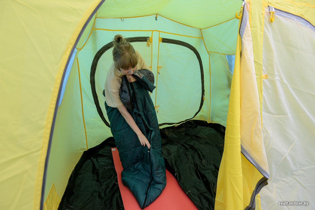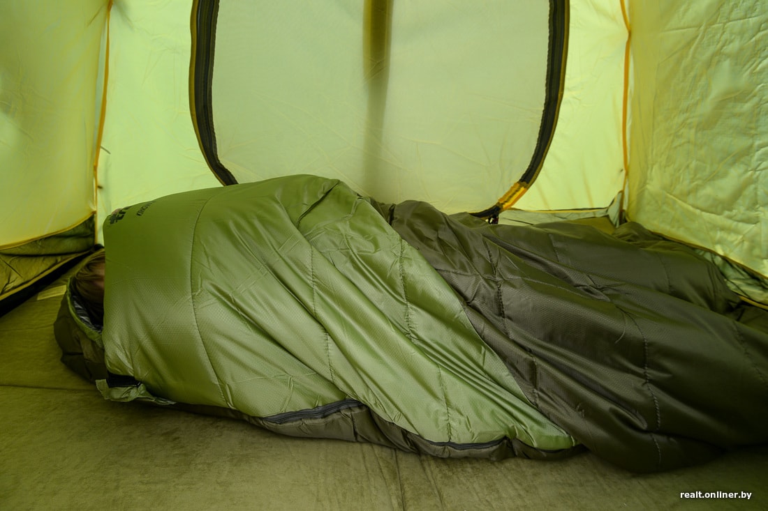 Tramp Kingwood Regular за 200 рублей — спальник-одеяло, в котором, по заверению производителей, можно спокойно перележать холодные зимние ночи в лесу или на озере. На бирке написано, что спать в нем комфортно в –5°, в –10° уже чуть менее комфортно, а в –25° совсем некомфортно, но выжить можно. Конечно, в +20° проверить это крайне сложно, но, занырнув внутрь, понимаешь, что он действительно очень теплый. Как будто лежишь дома, закутанный в фланелевое одеяло. Не хватает только кружечки чая (но это мы потом исправим). Еще и подголовник имеется, что, я считаю, мастхэв в спальнике: куда ж еще головушку приклонить? Не подушку же брать с собой, в самом деле. В таком случае лучше вообще дома сидеть.