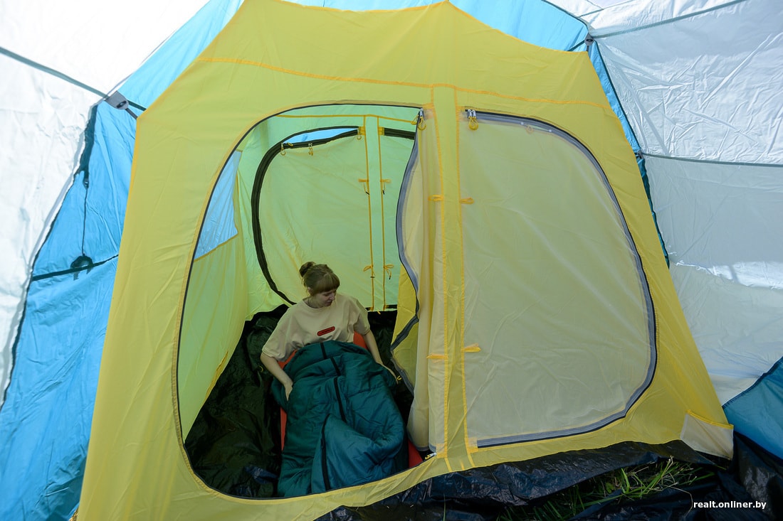 Проблемы возникли и с установкой внутренней палатки. Не сразу было понятно, как прицепить ее к тенту, да еще так, чтобы получилось ровно. У нас ее маленько перекосило. Ну да ладно, кое-как справились. Вроде все стоит, не шатается. Только выдохнули, как заметили в сумке еще два неиспользованных куска ткани. Один сначала пытались положить на тент: думали, это какая-то дополнительная защита от дождя. Но по размеру не подошел. Оказалось, это коврик для тамбура, где можно свои вещи положить… Ну или что там еще в этом тамбуре делают. Куда деть второй, так и не поняли. Позже я прочитала, что это перегородка между двумя спальными комнатами, на которые можно разделить палатку. Зачем она нужна, не очень понятно. По-честному, она вряд ли поможет уединиться…