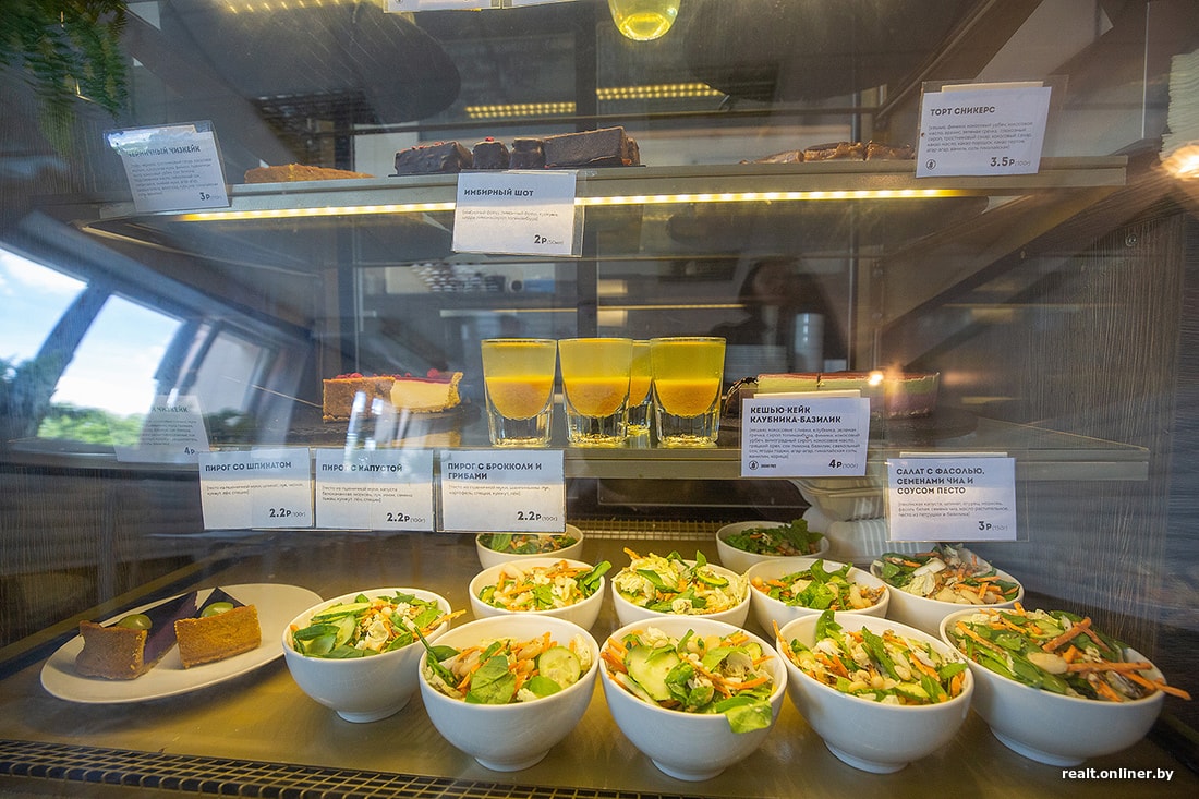 С 12:00 начинаются обеды. Выбор небольшой: как правило, это один вид супа, веганский стейк, парочка гарниров, парочка салатов. С трудом представляется, что, например, какой-нибудь рабочий завода удовлетворится таким выбором. Но девочки-официантки поделились: людей каждый день приходит очень много, особенно в период с 13:00 до 15:00, и веганская еда их не пугает, а, наоборот, привлекает.