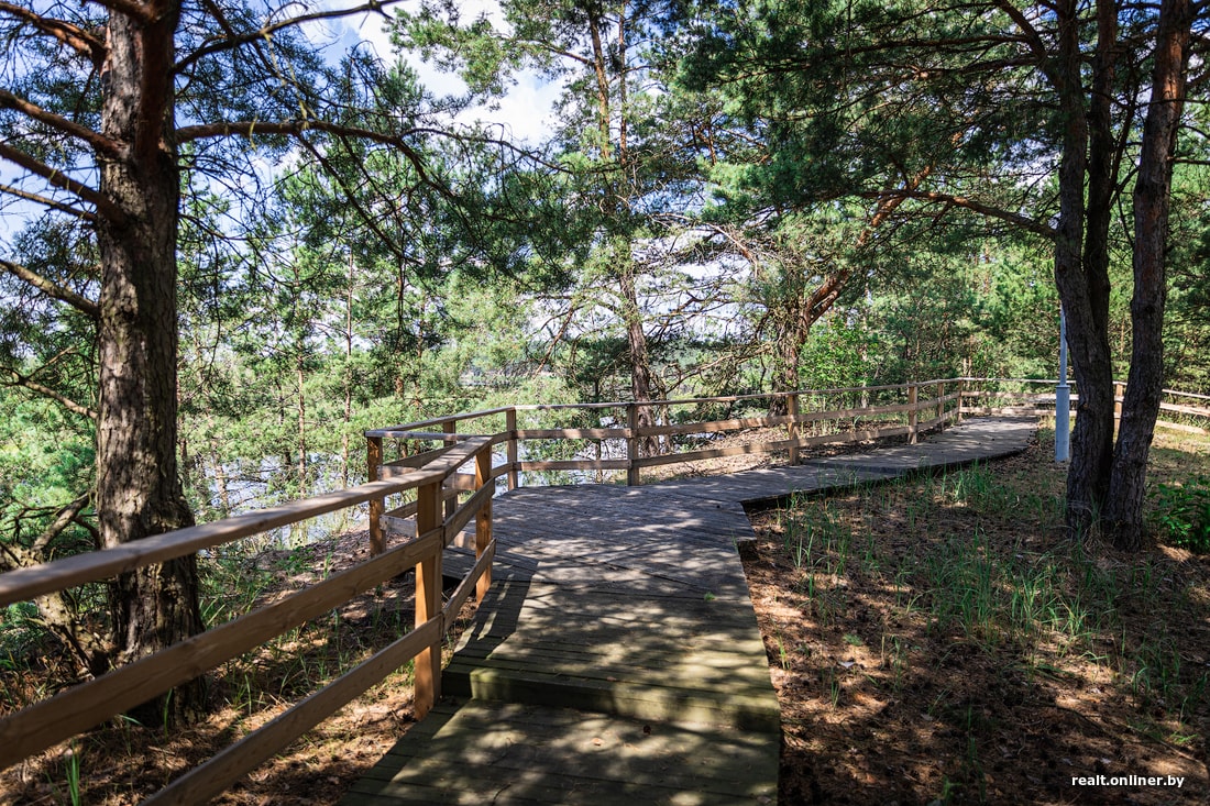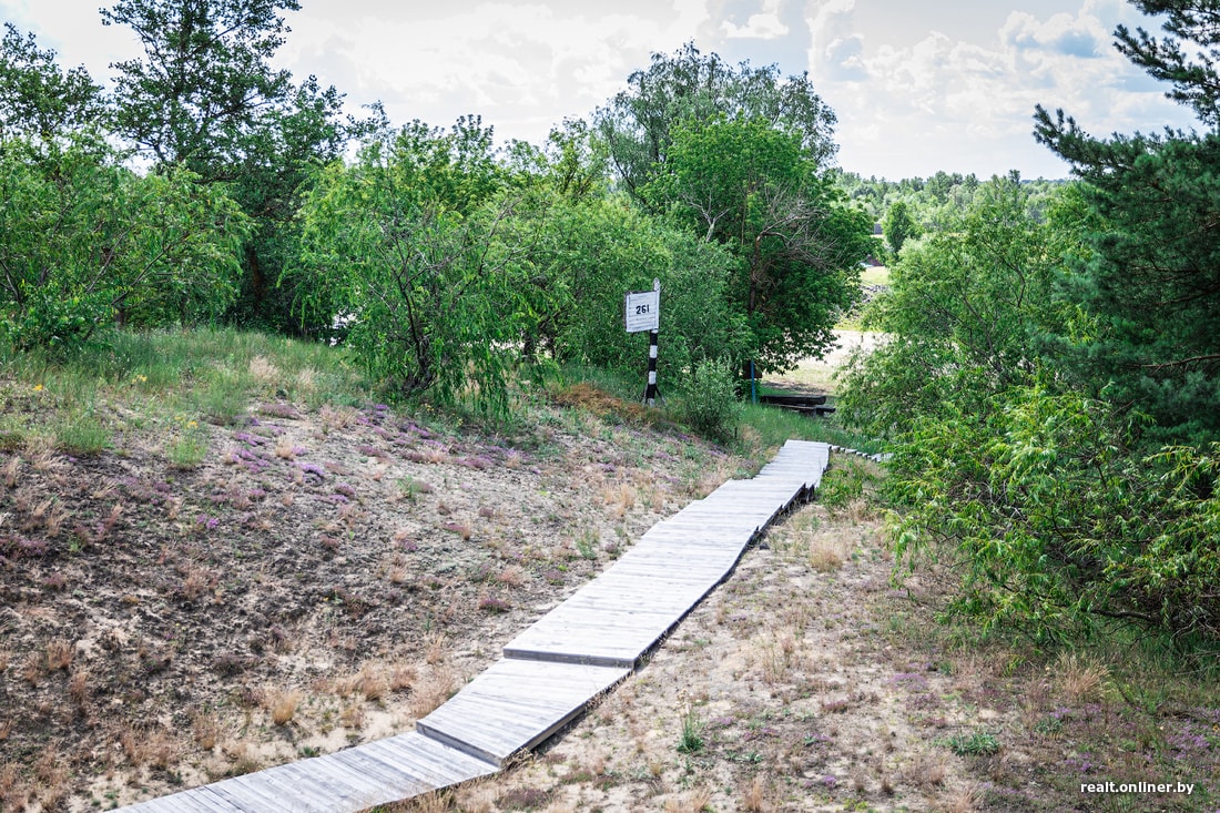 Деревянный настил протянулся метров на триста вдоль высокого берега. Чем-то он напомнил нам дорожки для пеших прогулок на побережье в Паланге. Если пройти чуть дальше по лесу, можно найти укромные места над обрывом и посидеть в тишине, глядя на течение Припяти.